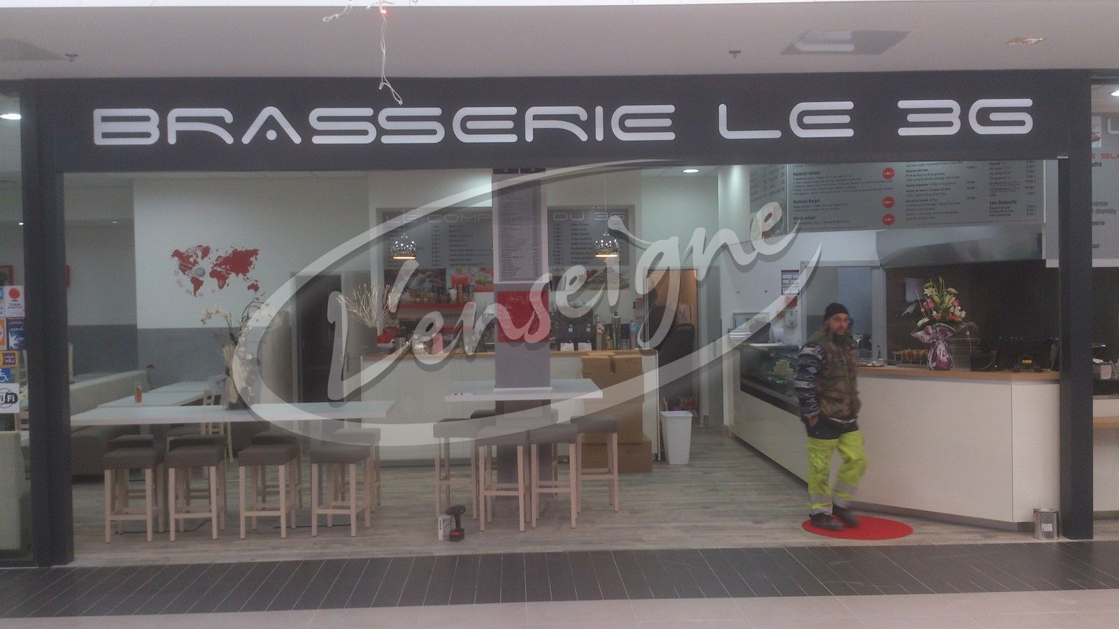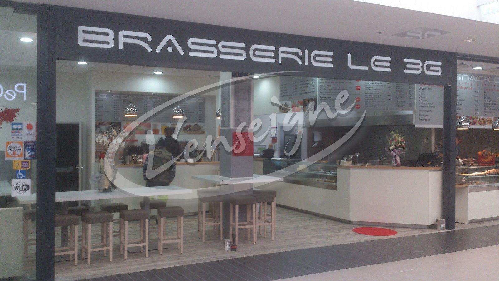 Pour la Brasserie Le 3G situé dans le centre commercial Avant Cap à Plan de Campagne, L'Enseigne a fabriqué et installé un caisson lumineux en aluminium laqué gris, où seul le texte est lumineux.