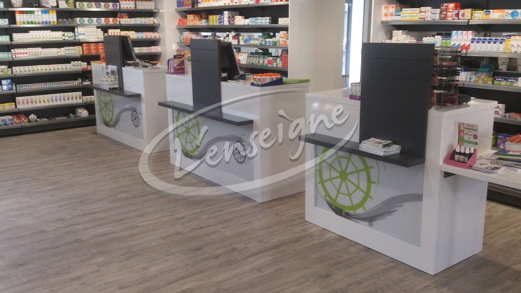 Dans ces pharmacies, la décoration de ces banques d'accueil sont réalisées en adhésif numérique.