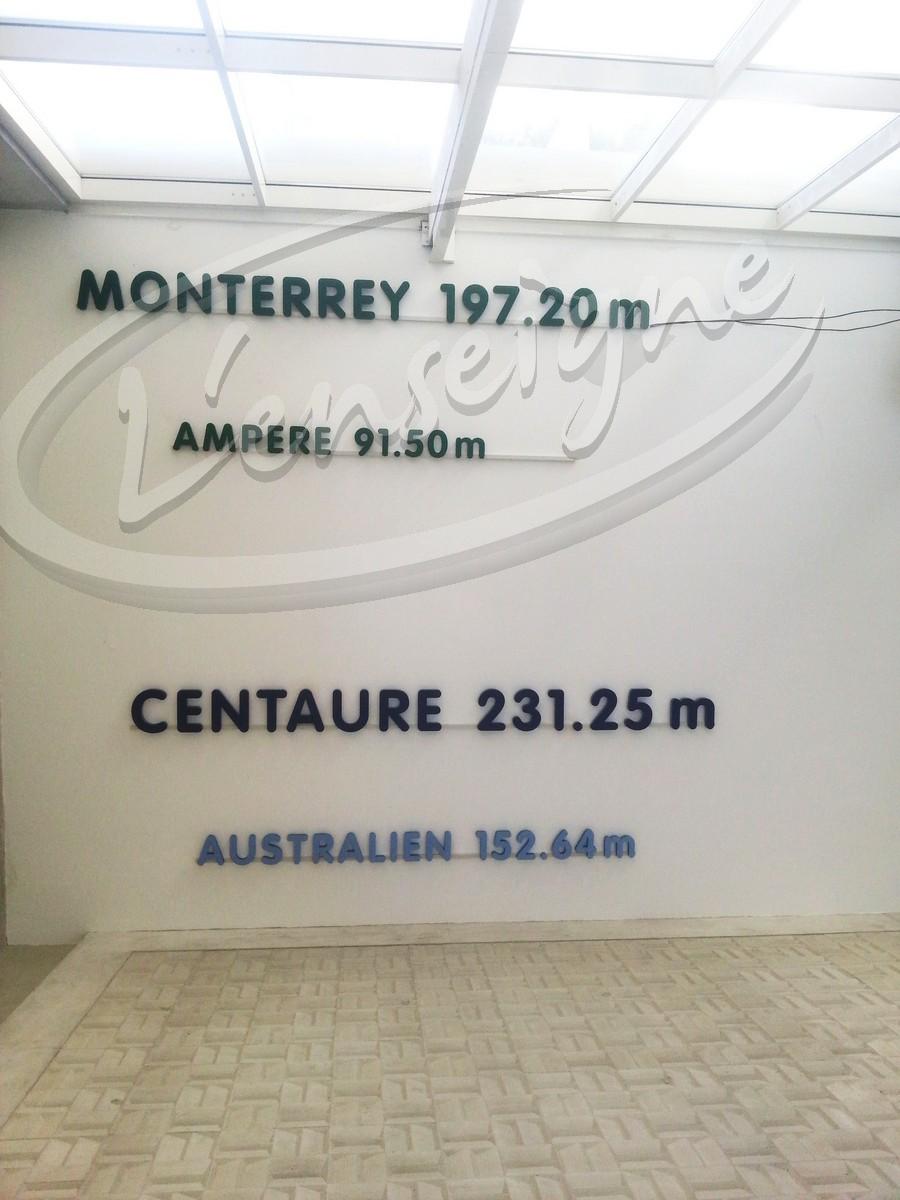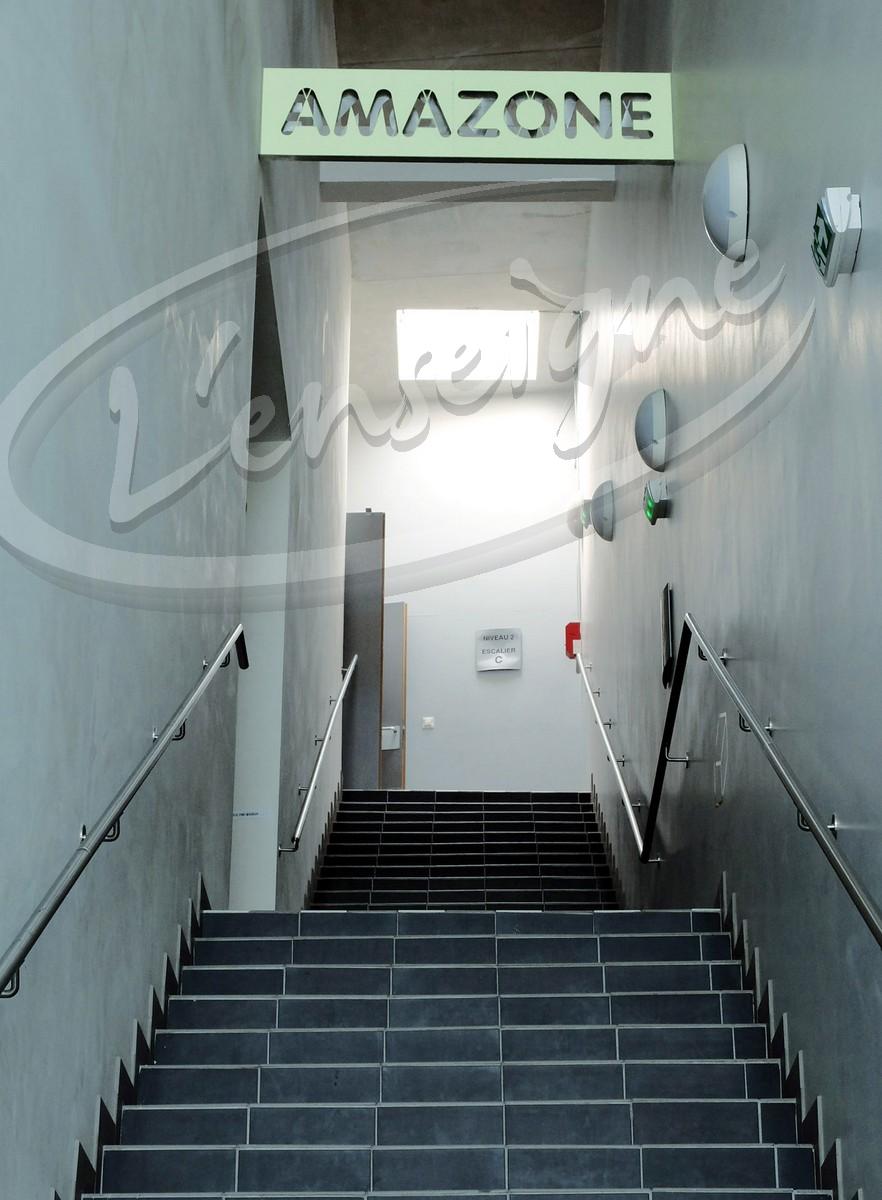 A l’intérieur, différents textes en PVC ont été découpés et placés sur les murs de l’établissement. Au-dessus des escaliers, vous pourrez découvrir une tôle en aluminium laqué vert découpé selon le texte souhaité.