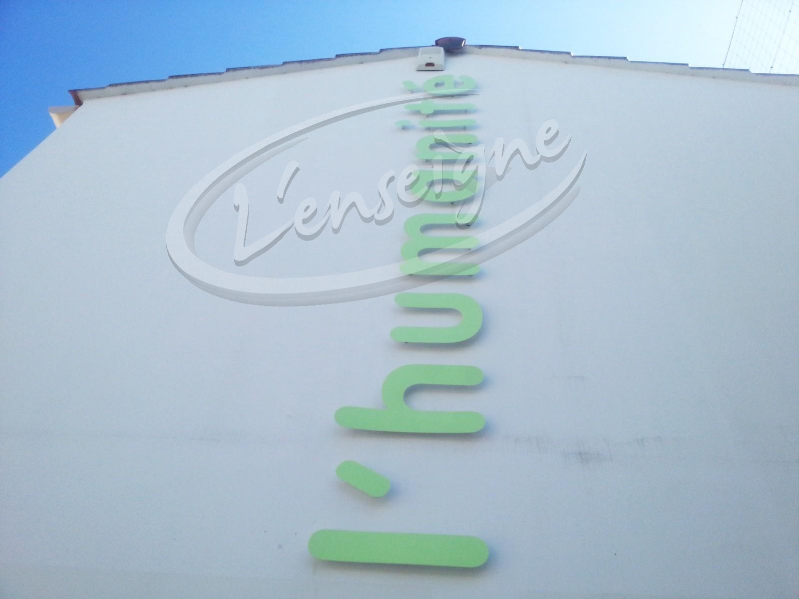 A l’extérieur, tous les bâtiments ont été habillés par des lettres reliefs en aluminium fixées par entretoises d’écartement. Ces lettres ont la particularité d’être phosphorescentes, ce qui permet au collège d’être visible de nuit.