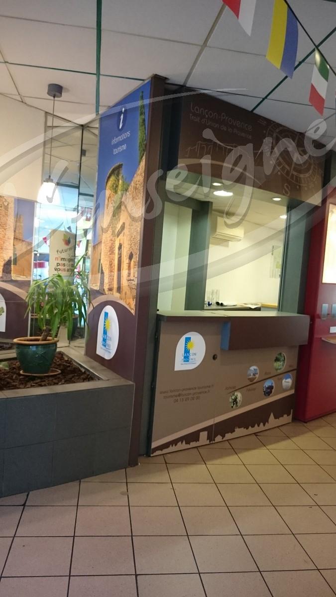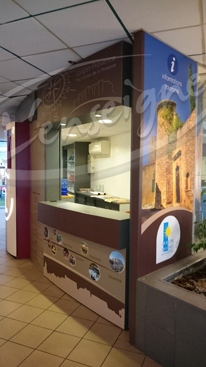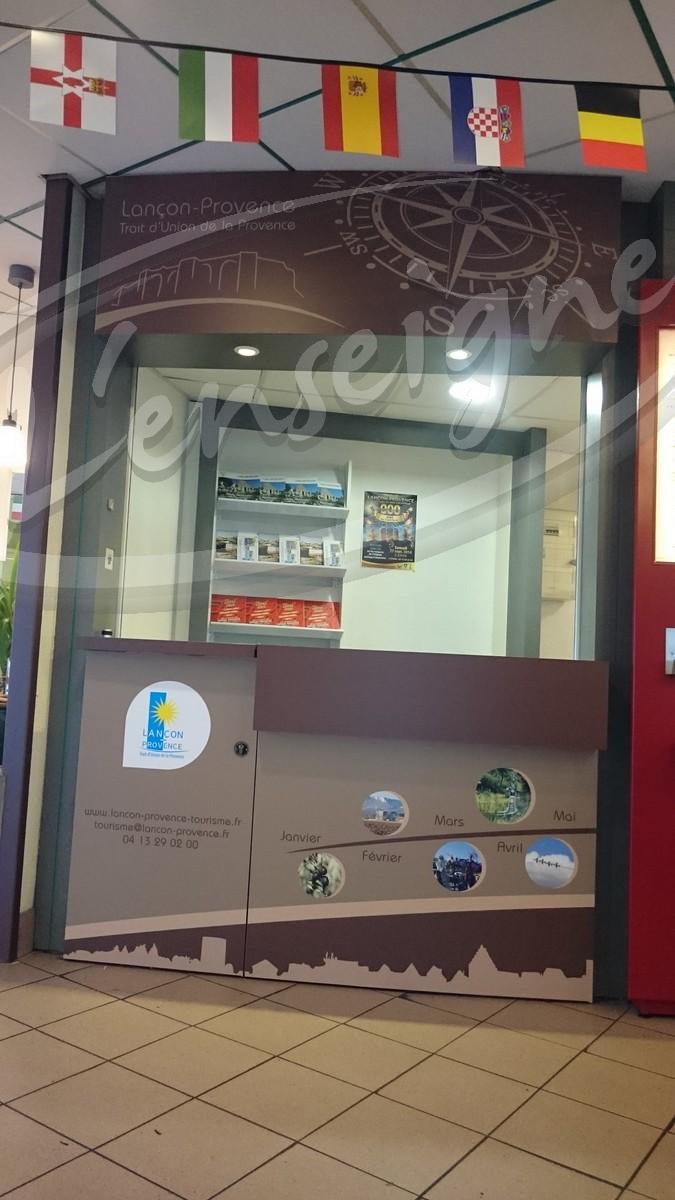 Nous avons donc réalisé l'habillage de son kiosque grâce à des panneaux plats complétés par de l'adhésif numérique avec film de plastification anti UV.