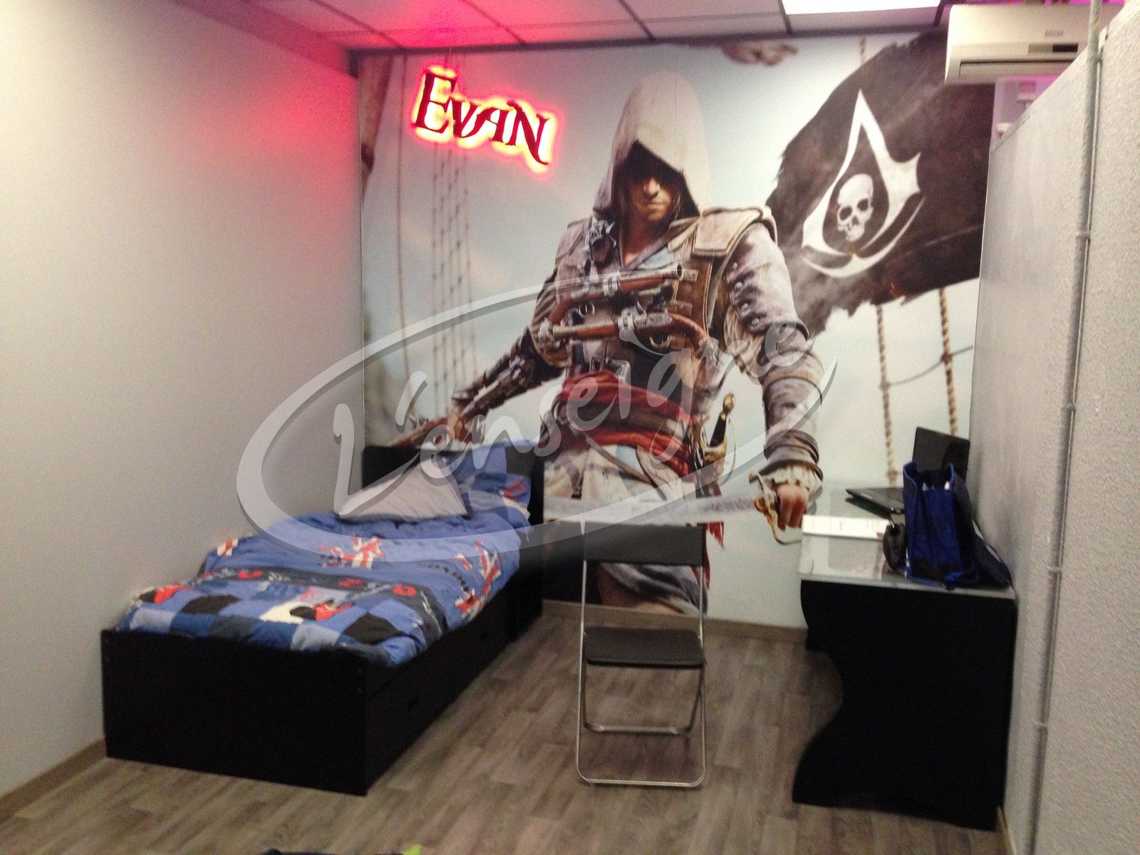 Dans cette chambre avec un thème pirate, nous avons réalisé le recouvrement d'un mur en adhésif numérique, le prénom est en lettres PVC laqué noir avec des diodes rouges, un adhésif numérique a été collé sur la porte, et en décoration mural ce bateau pirate découpé en PVC laqué.