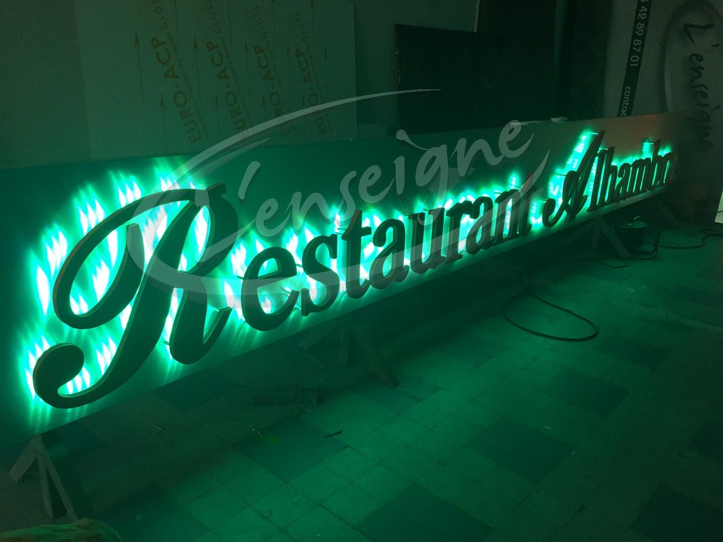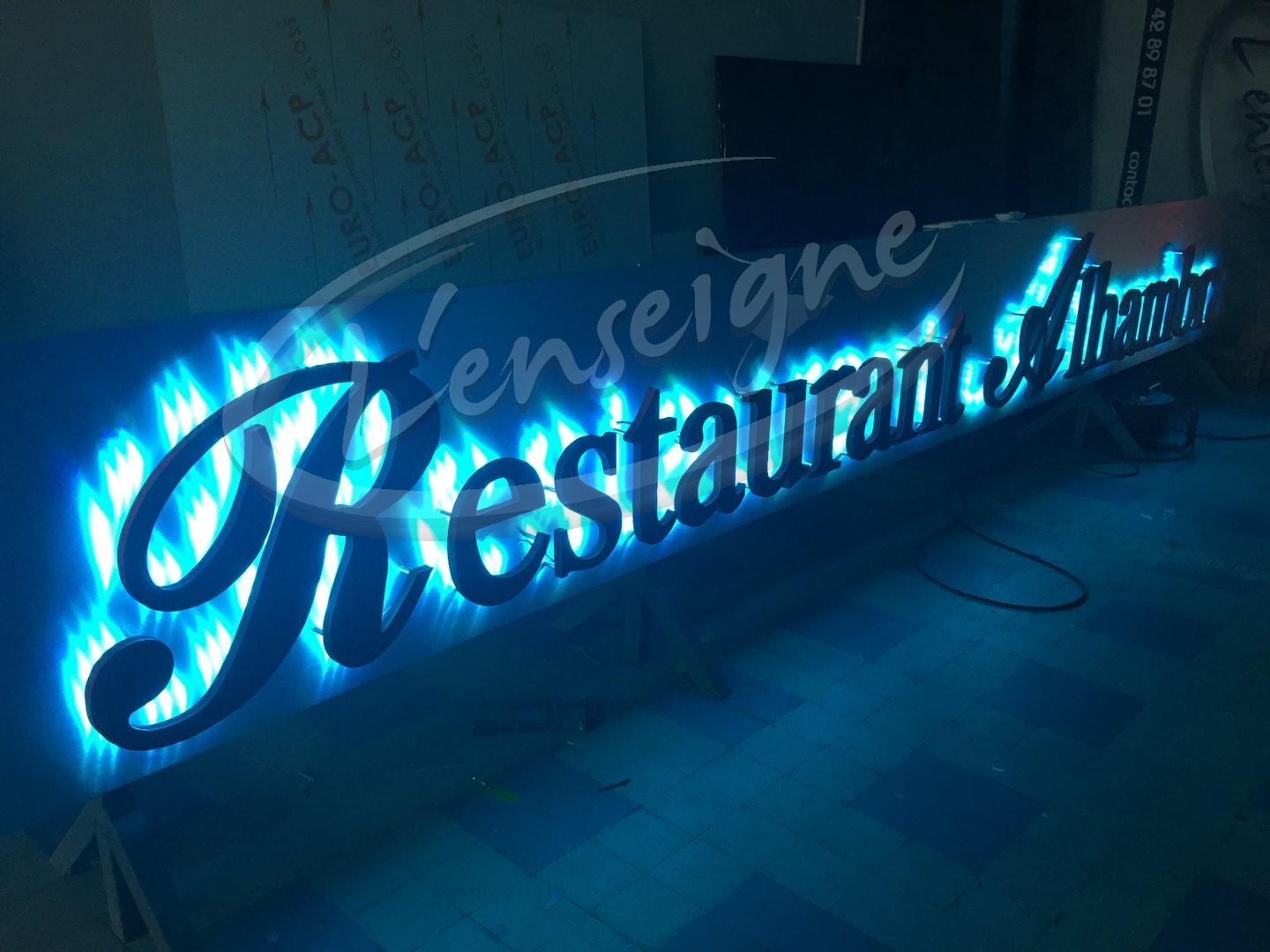 Ce panneau de restaurant est composé d'un panneau de fond en aluminium dibond laqué sur lequel des lettres en reliefs sont fixées par des entretoises d'écartement. Les lettres en reliefs lumineuses sont en PVC, un éclairage par modules de diodes à changement de couleur est positionné au dos des lettres, l'animation de couleurs est pilotée par une télécommande.