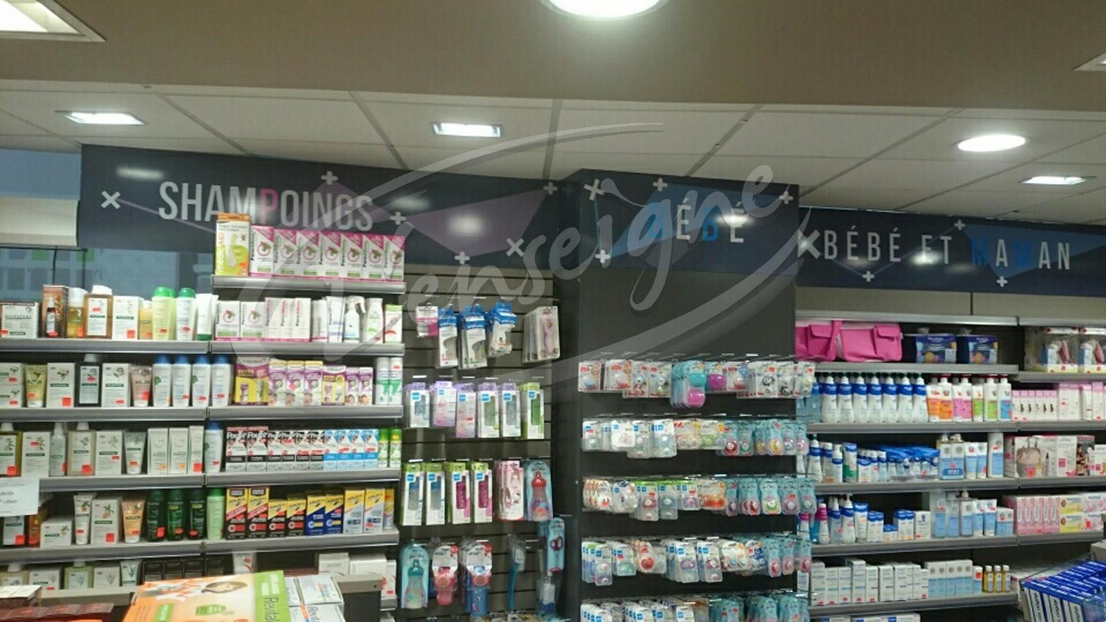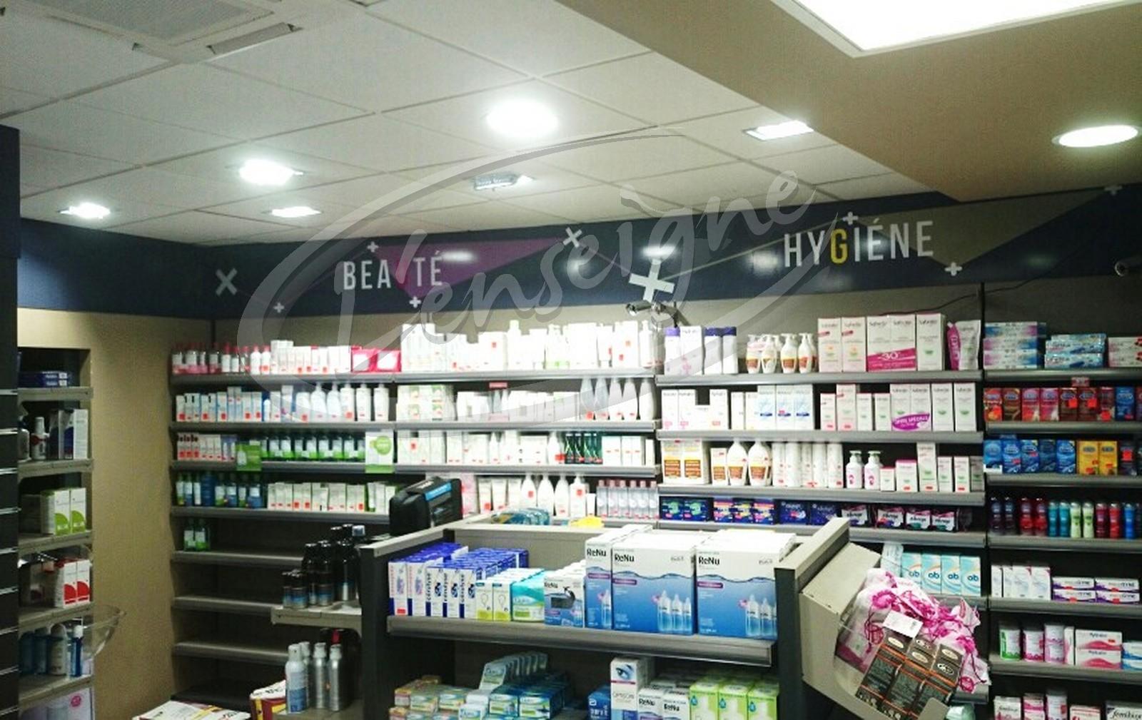 Pour compléter ce projet, nous avons appliqué sur les comptoirs et bandeaux en PVC une décoration adhésive numérique. Ainsi, les différents pôles de la pharmacie sont facilement reconnaissables pour la clientèle.