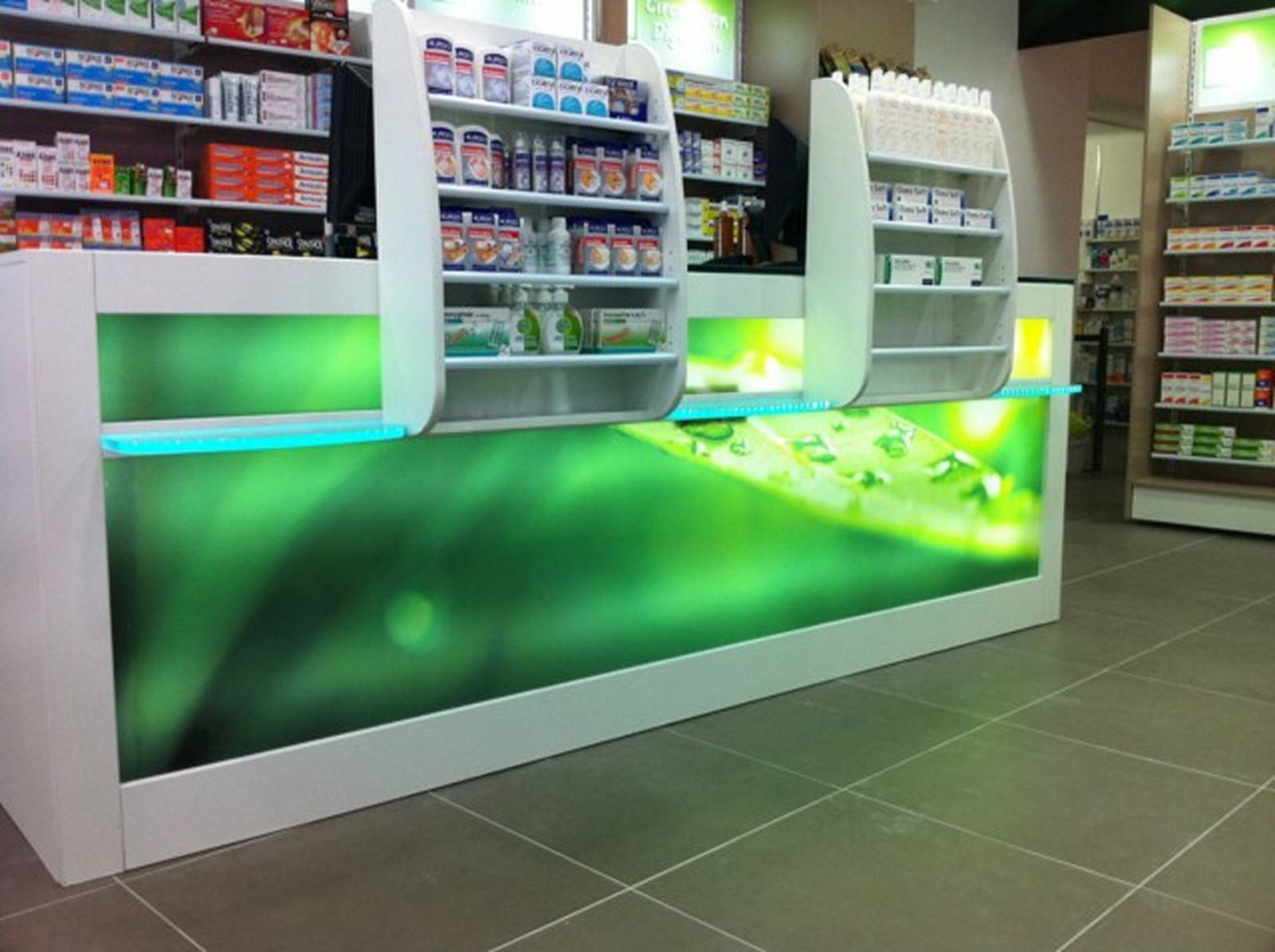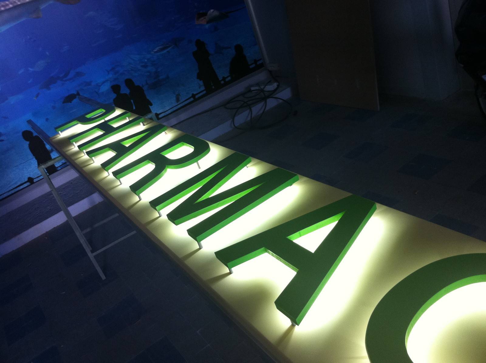 Les lettres en reliefs vertes "PHARMACIE" sont en PVC d'une épaisseur de 20mm laqué, celle-ci sont rétro éclairées grâce à des diodes apposées à l'arrière.