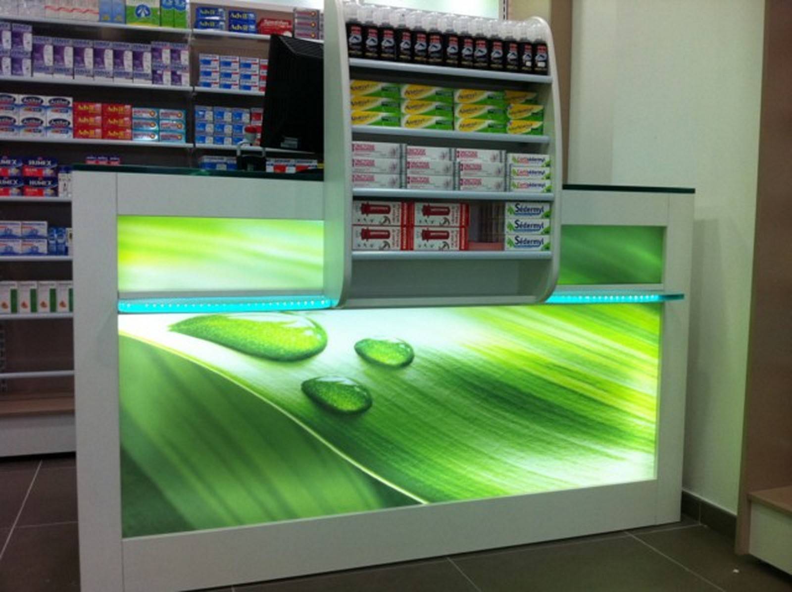 A l'intérieur, des caissons lumineux permettent de faire ressortir le mobilier : comptoir de caisse, banque d'accueil, etc.