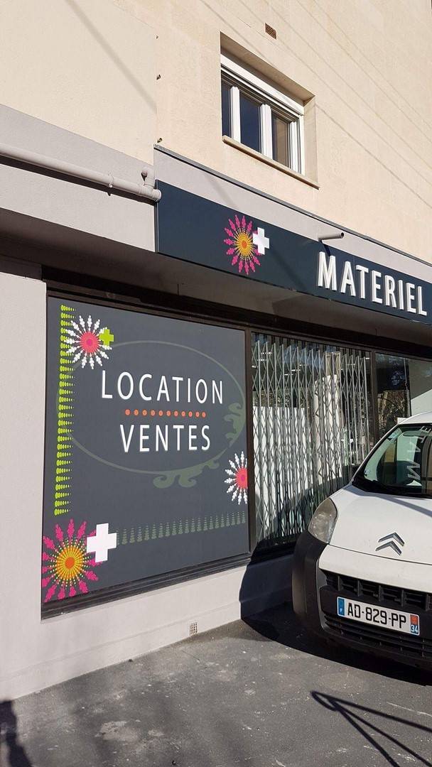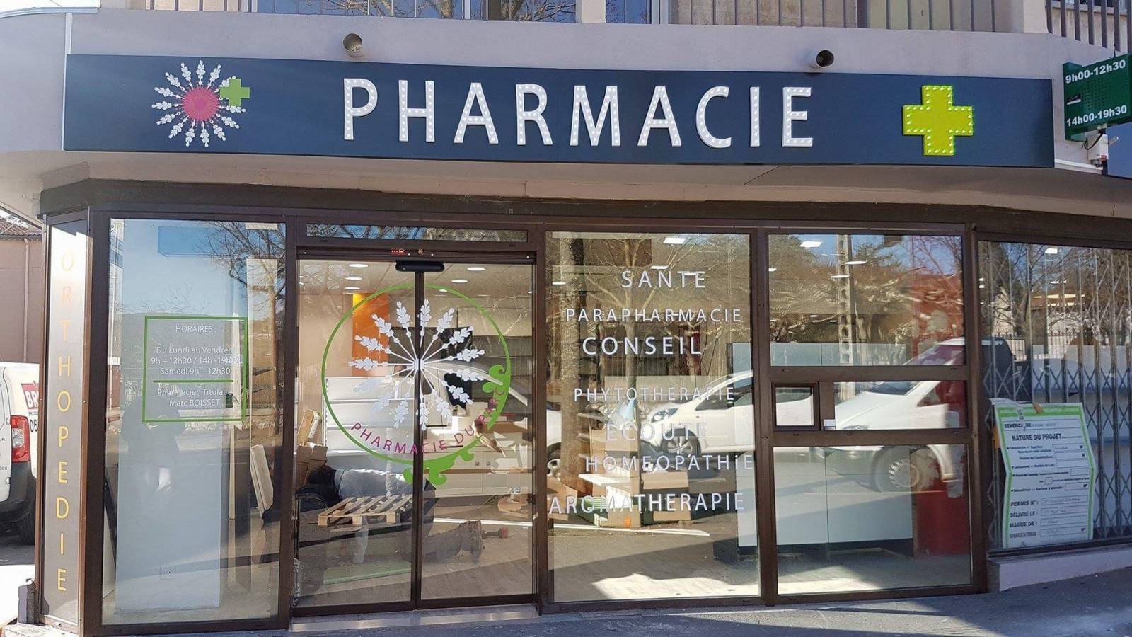 Pour la communication et la décoration extérieure de la pharmacie, nous avons opté pour une décoration de vitrine avec textes communicants et éléments décoratifs suivant l'identité que nous avons créé.