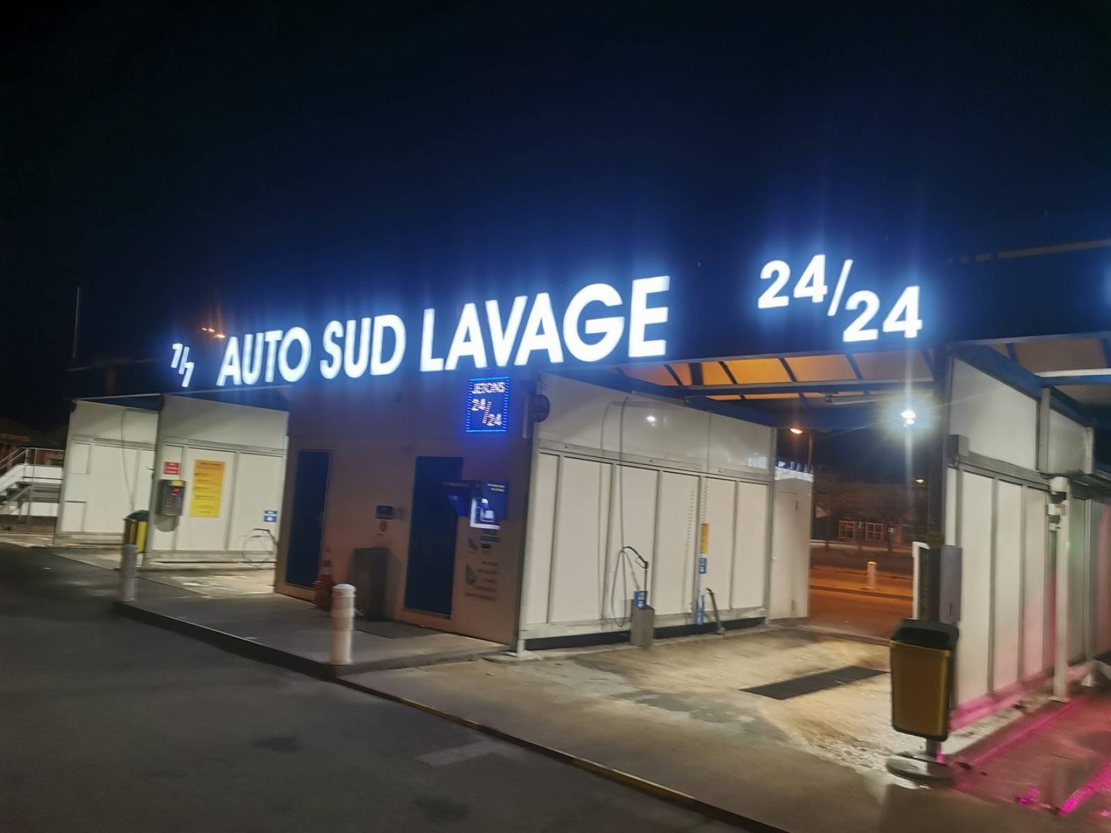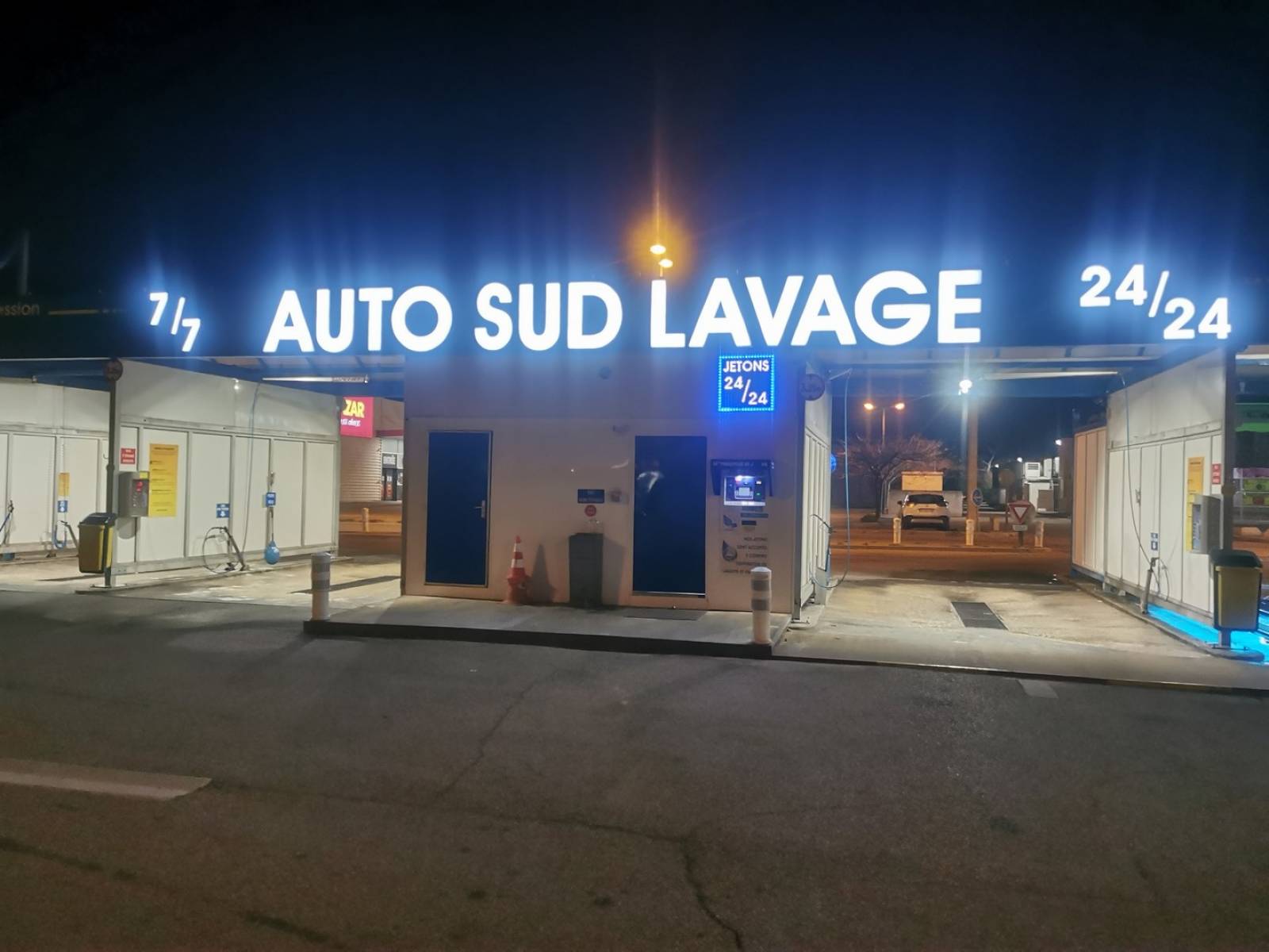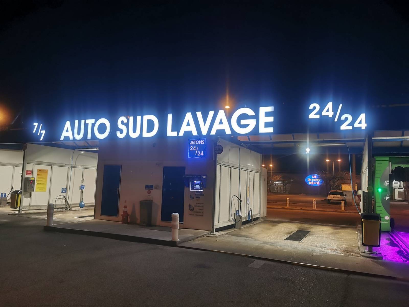 La station Auto Sud Lavage à Istres nous a confié la réalisation et l'installation de leurs enseigne avec des lettres reliefs lumineuses.