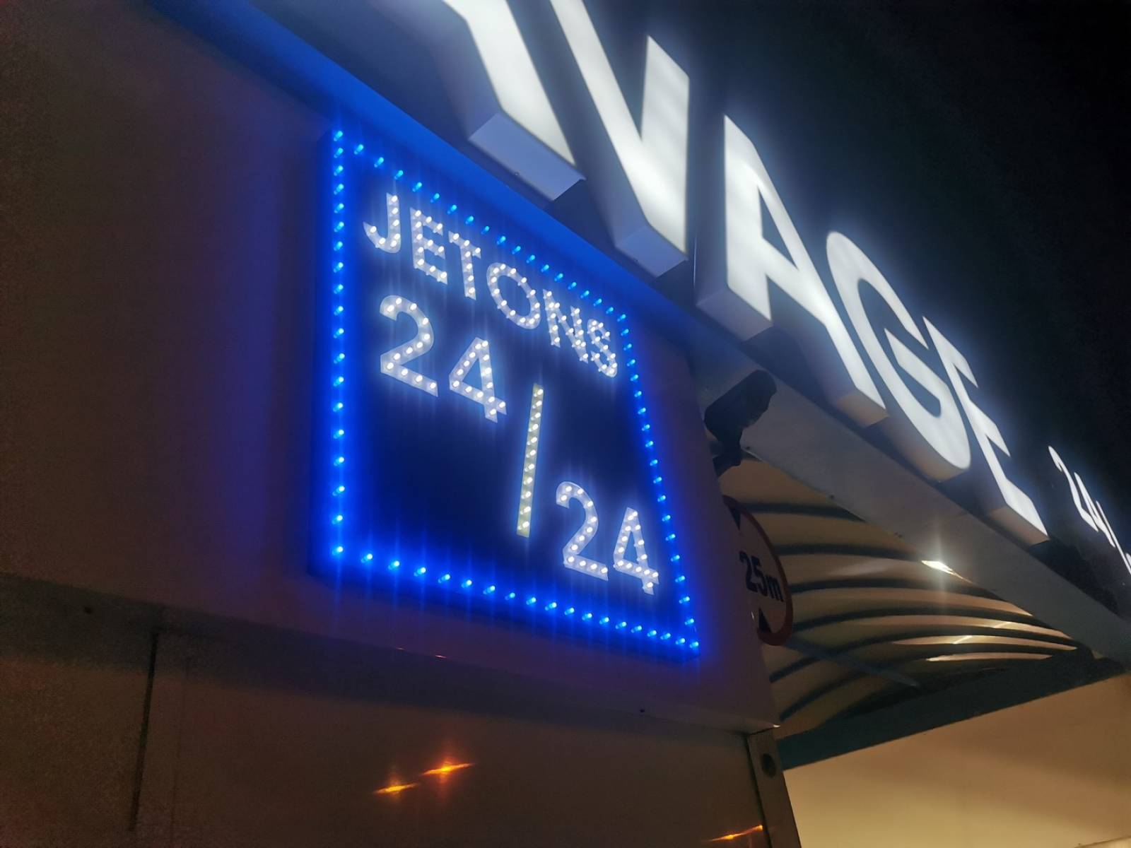 Le panneau "JETONS 24/24" est un panneau plié avec un marquage du texte en adhésif de découpe sur lequel des points de diodes viennent éclairés chaque lettres.