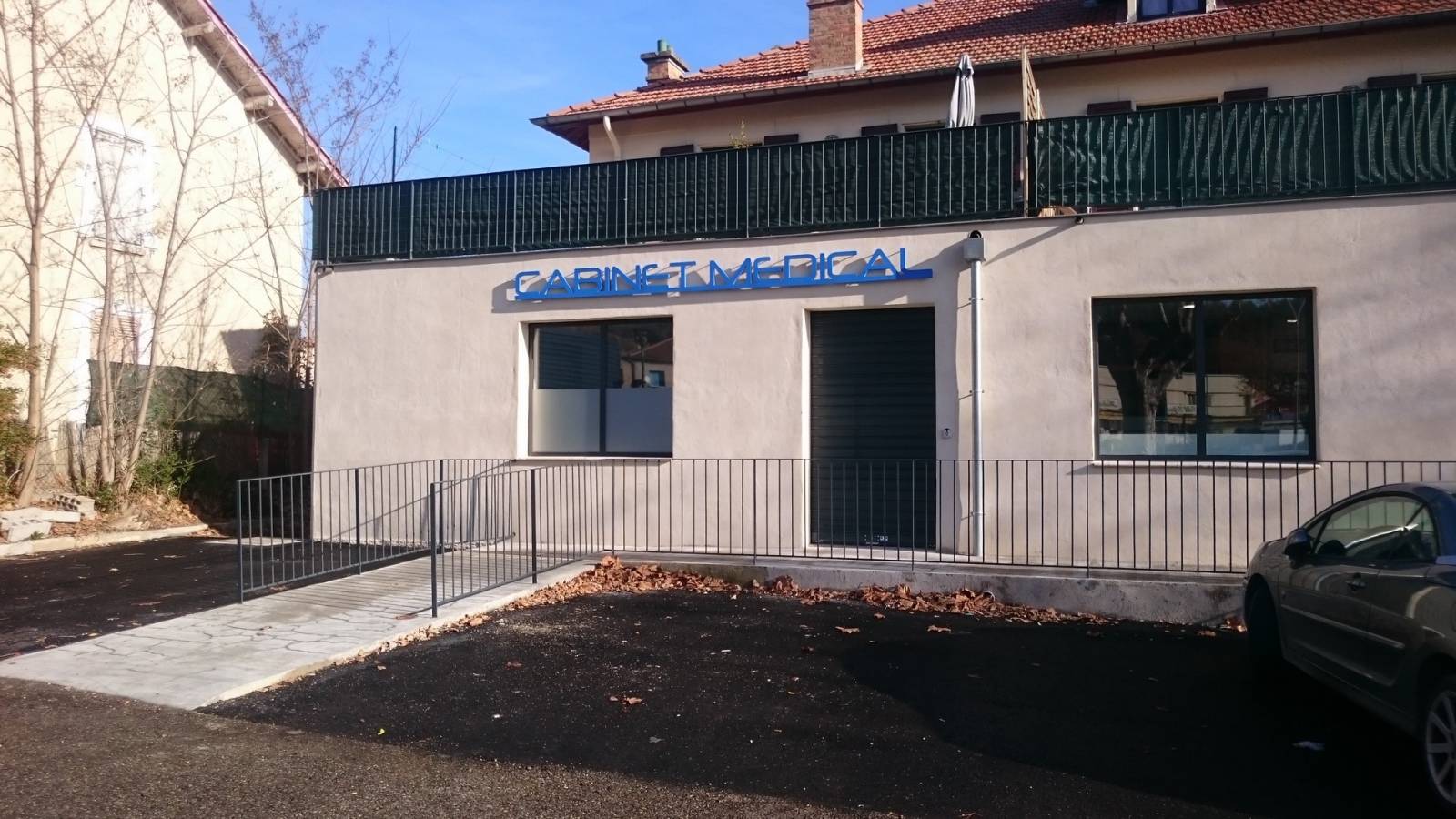 L'enseigne "PHARMACIE" et "MATERIEL MEDICAL" est composée de lettres reliefs bleues et vertes d'une épaisseur de 20mm, l'ensemble est installée sur des entretoises d'écartement.