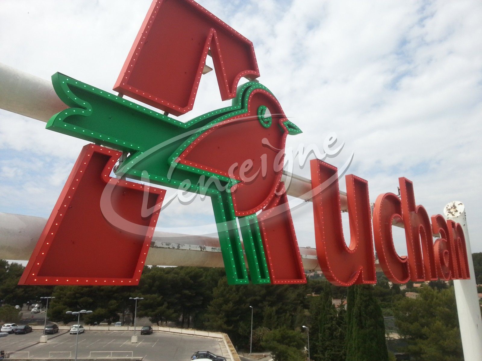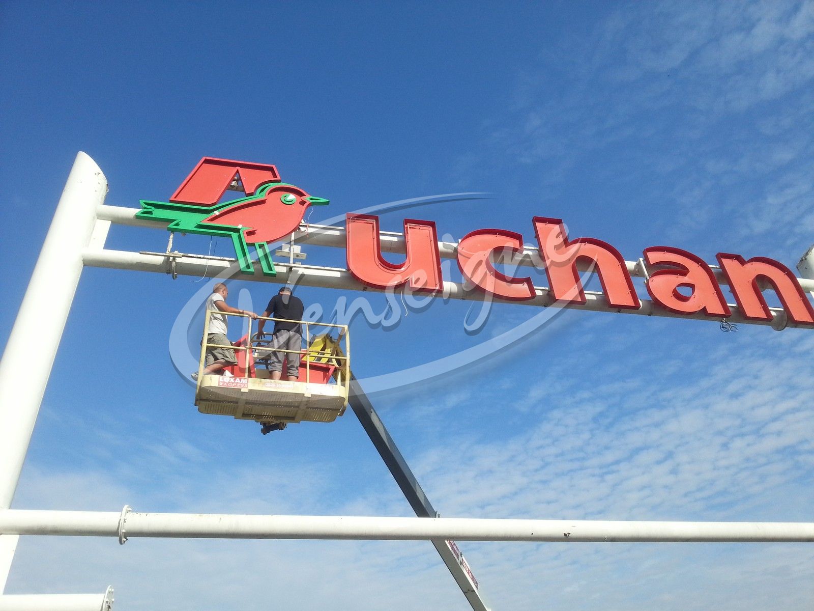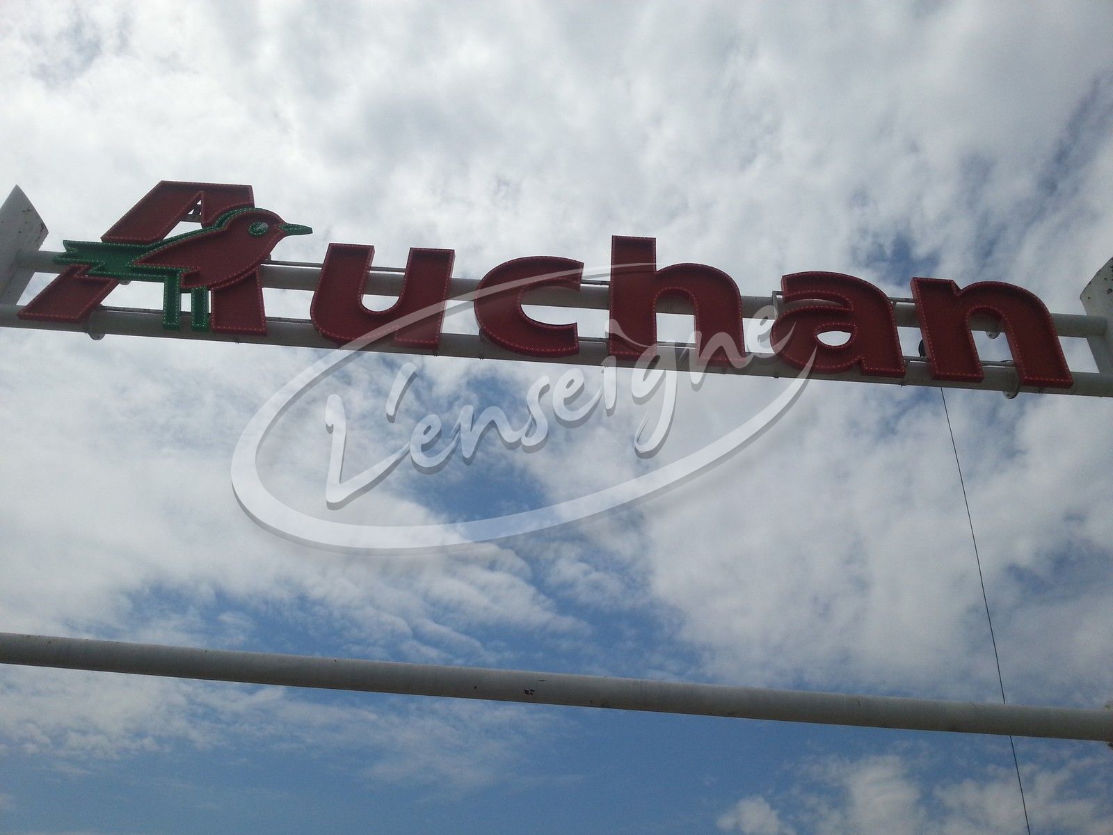 Auchan Martigues nous a confié la rénovation de l'éclairage sur une enseigne portique. Pour ce projet, il était question de remettre en état l'éclairage de cette enseigne, nous avons donc démonté l'éclairage en tubes néons qui était HS puis nous avons installé des modules de diodes point à point sur l'ensemble du texte. Le logo a été entièrement refait à neuf dans notre atelier.