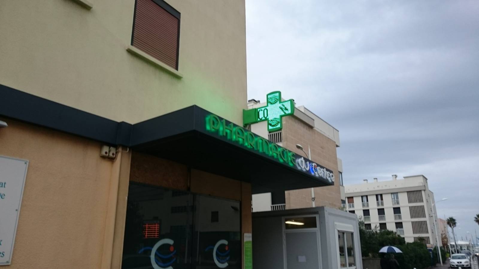 Pour cette pharmacie, nous avons pris en charge la fabrication ainsi que la pose de bandeaux en tôle aluminium dibond pliés sur les 4 bords, mais aussi des lettres reliefs en PVC avec rétroéclairage par diodes vertes et blanches.