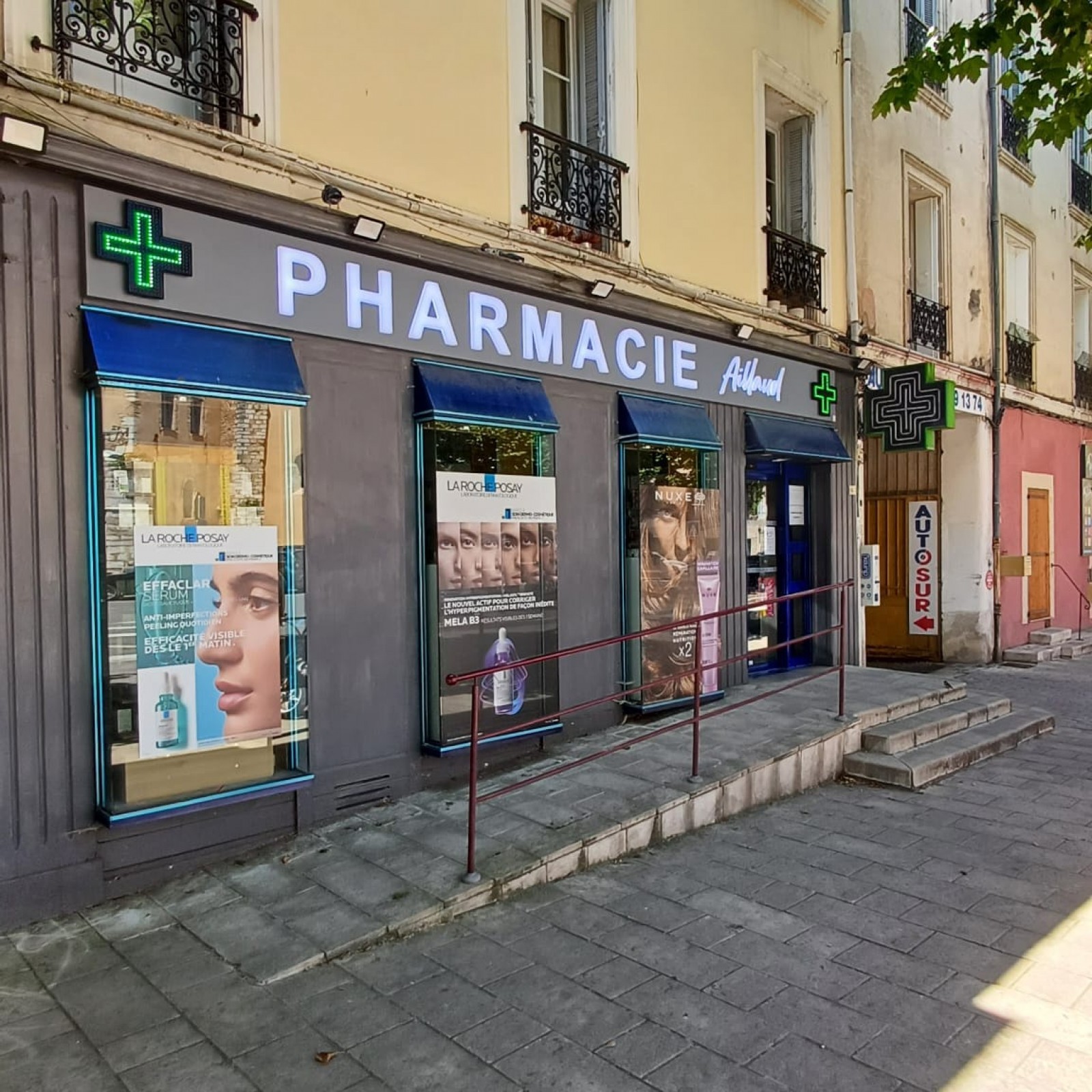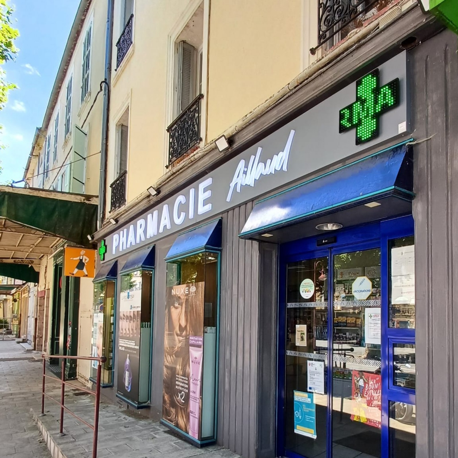 Le texte « PHARMACIE AILLAUD » est fabriqué en lettres plexiglas bloc LED de 30 mm d’épaisseur, avec faces et chants lumineux pour une visibilité optimale, de jour comme de nuit. Ce type de lettres lumineuses, à la fois modernes et très efficaces, permet de renforcer l’identité visuelle de l’officine tout en améliorant son repérage.