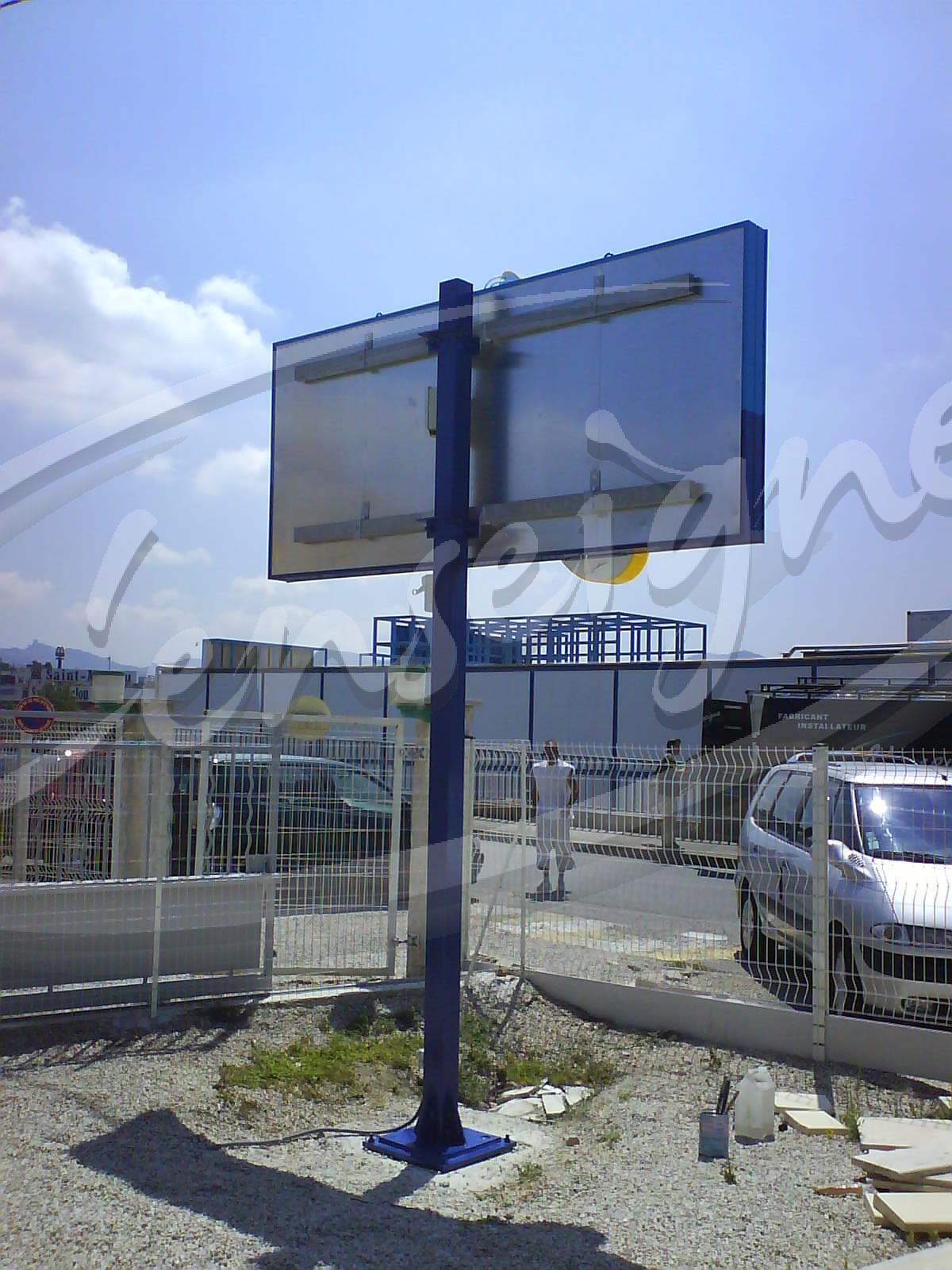 La société L'Enseigne fabrique et installe des panneaux de signalisation sur pied.