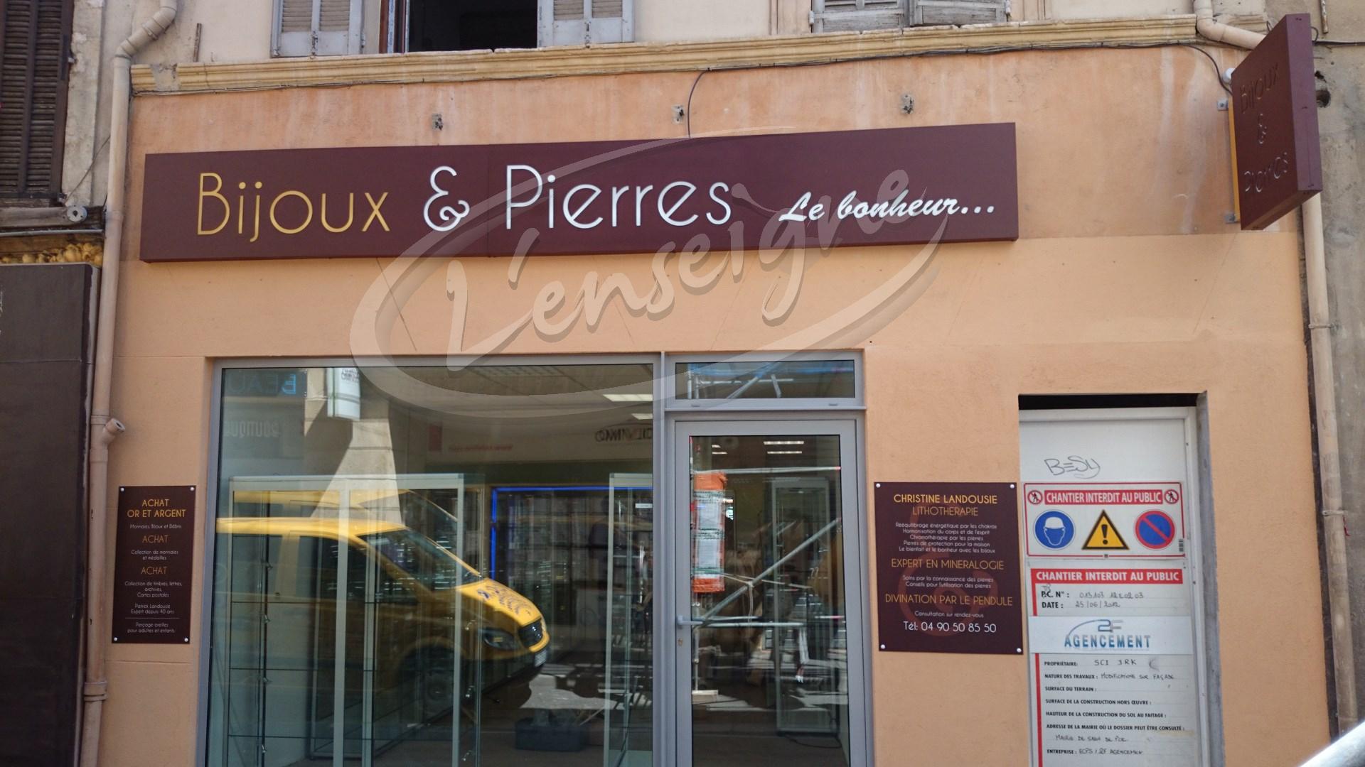 Pour Bijoux & Pierre à Salon de Provence, L'Enseigne a réalisé un caisson lumineux de façade et un caisson drapeau lumineux.