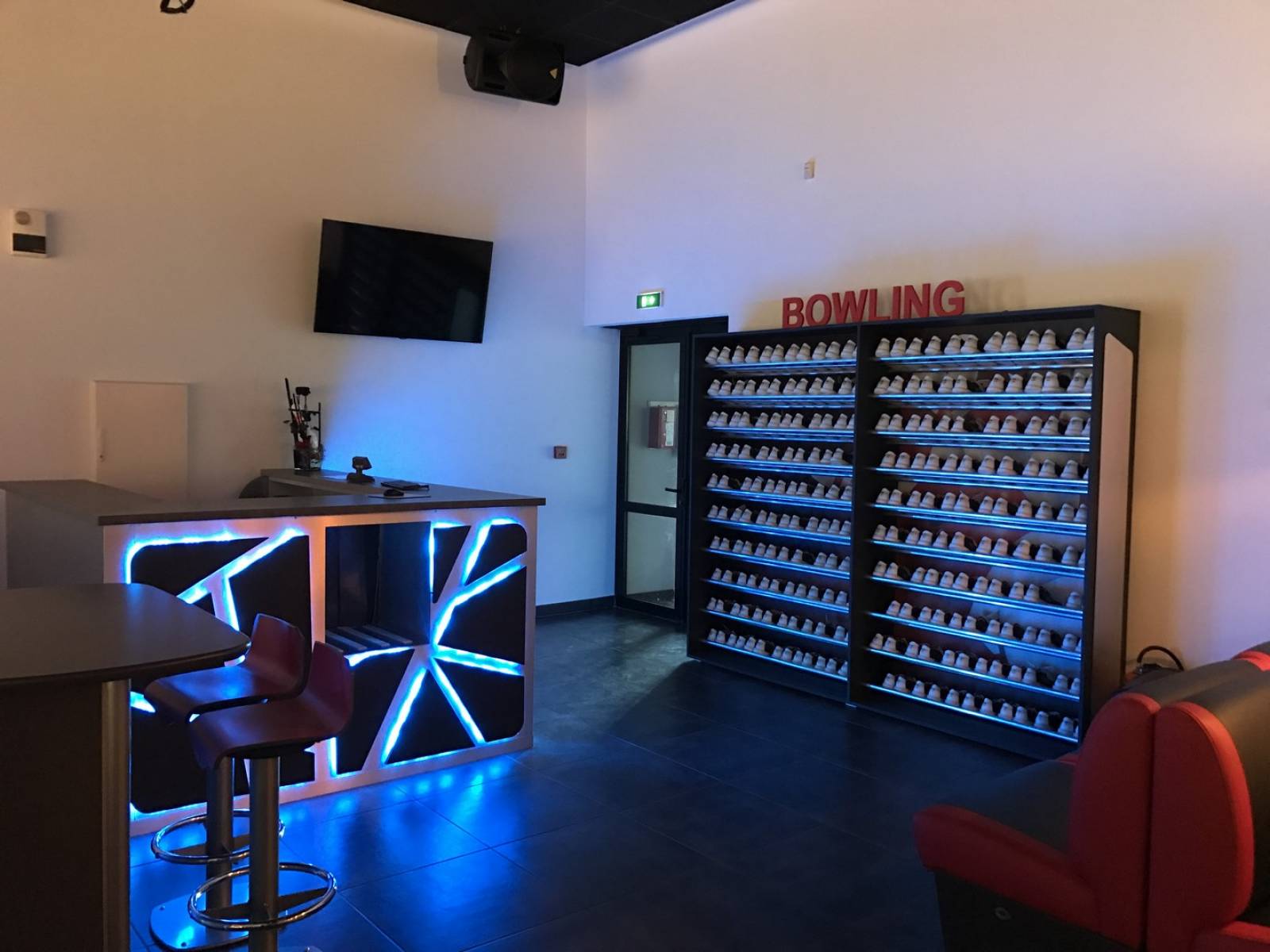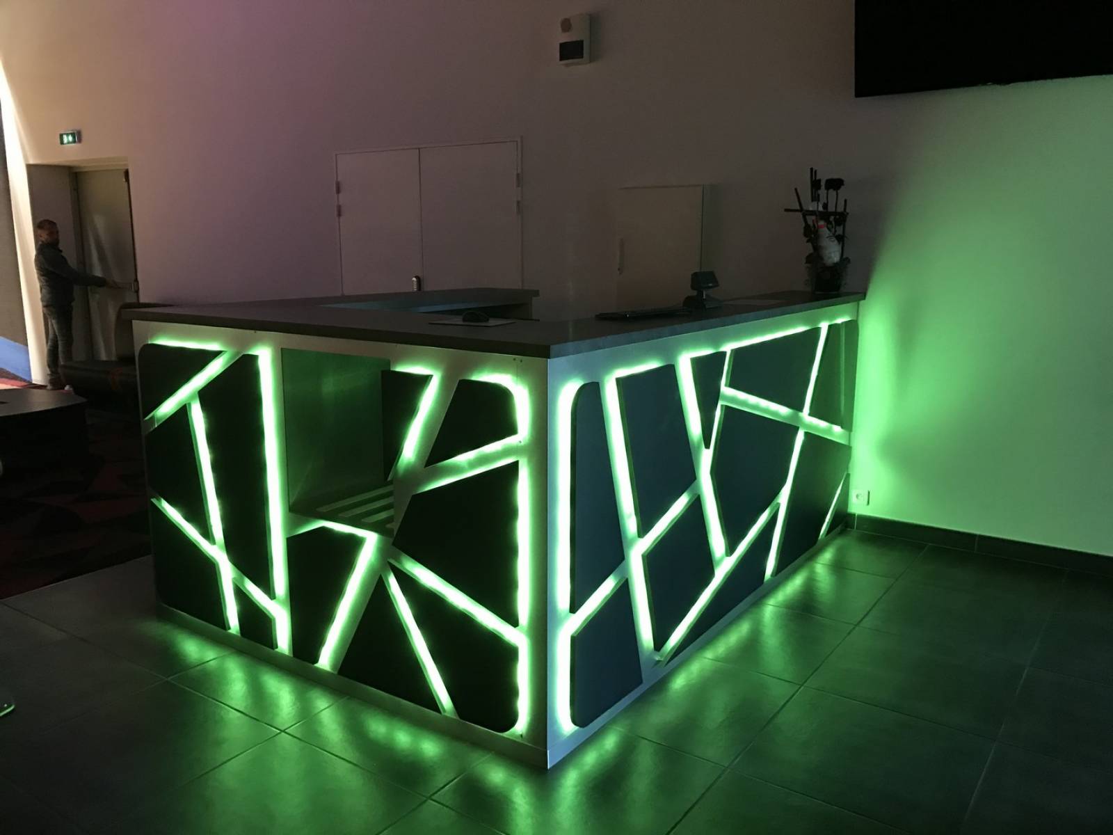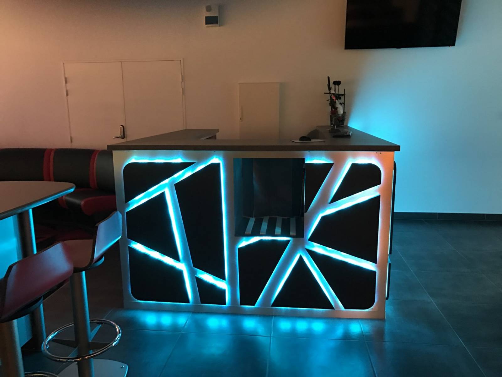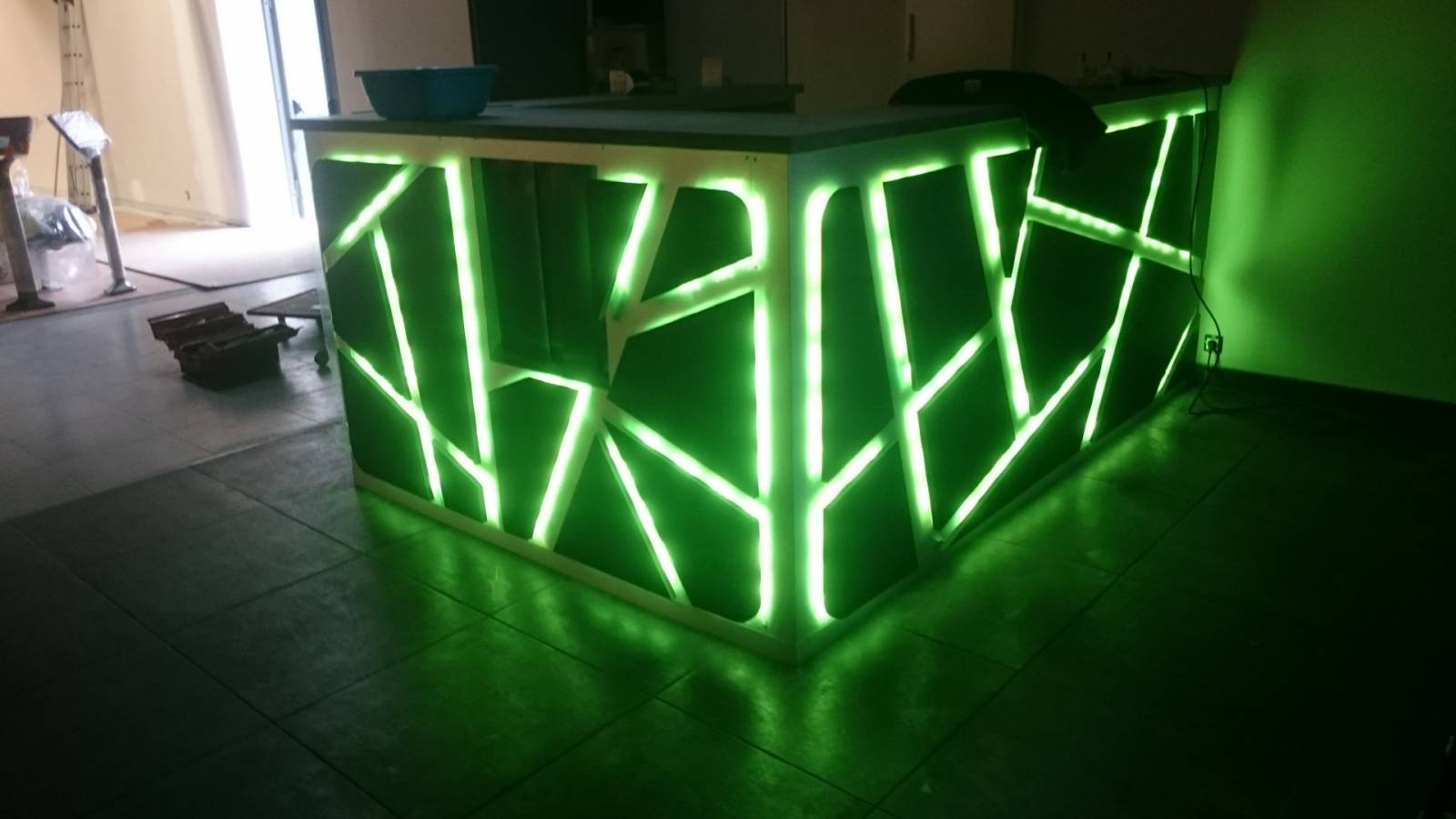 Ce comptoir professionnel pour bowling a une structure en tube aluminium brut recouvert de plaque d'aluminium brossé, sur lequel des élements géométriques sont positionnés en écartement permettant ainsi un éclairage à changement de couleur diffusant.