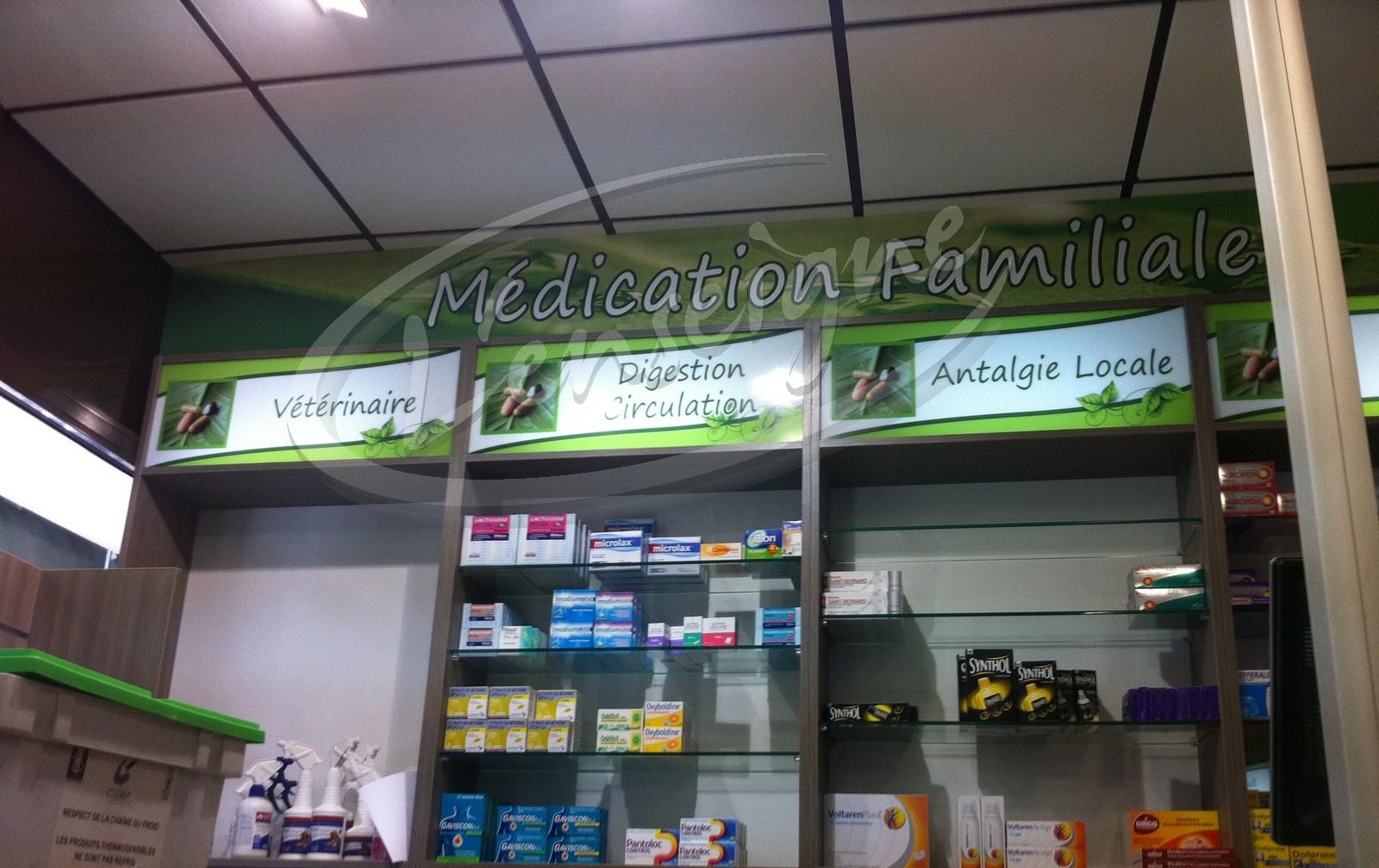 Pour l'intérieur de la pharmacie, les textes sont mis en valeur grâce à des caissons lumineux qui permettent leur éclairage ainsi qu'une bonne visibilité.