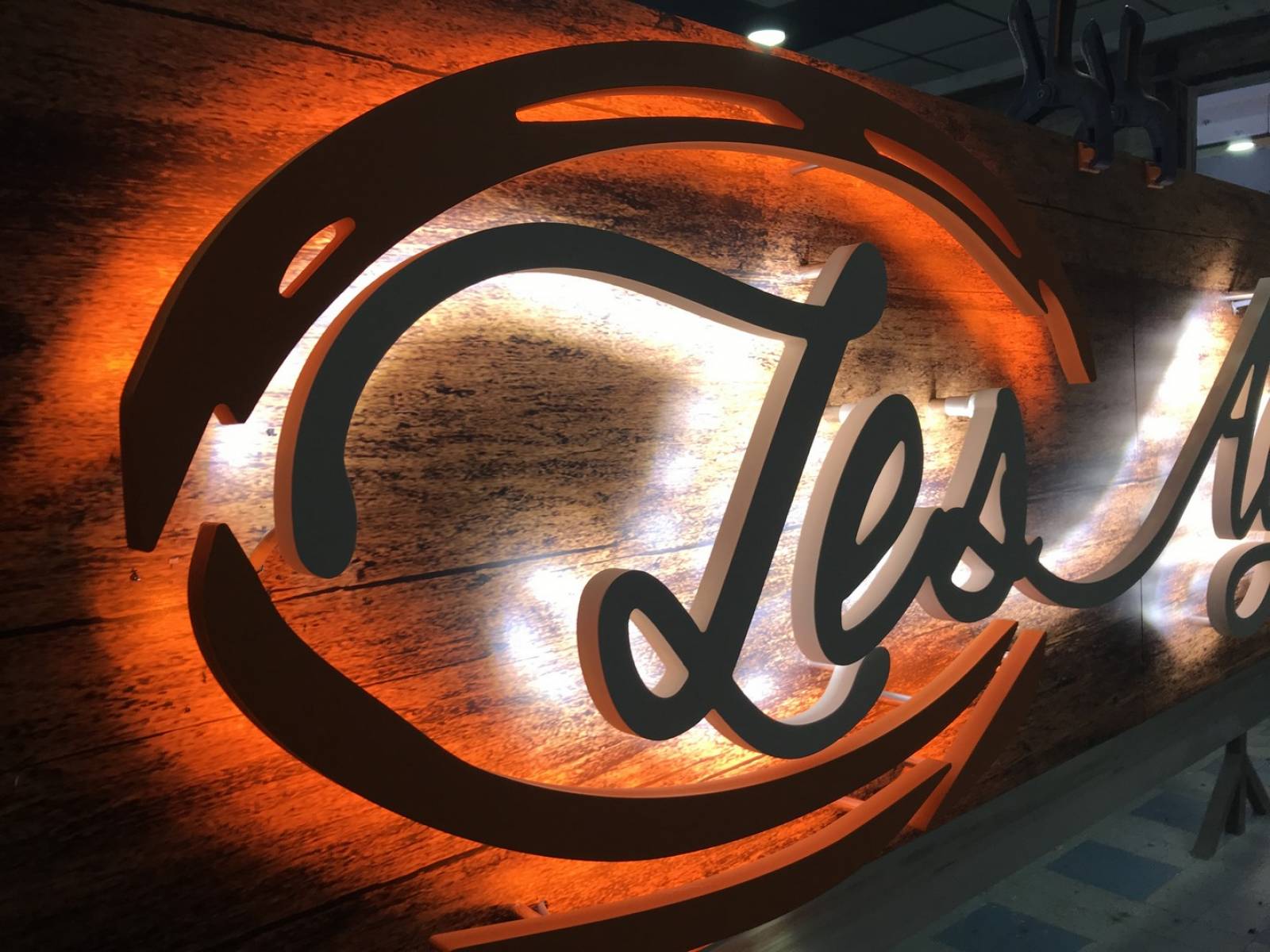 lettres reliefs rétro-éclairées sont en PVC d'une épaisseur 19mm et 10mm, ces deux textes sont rétro-éclairés par des modules de diodes orange et blanc positionnés au dos des lettres.