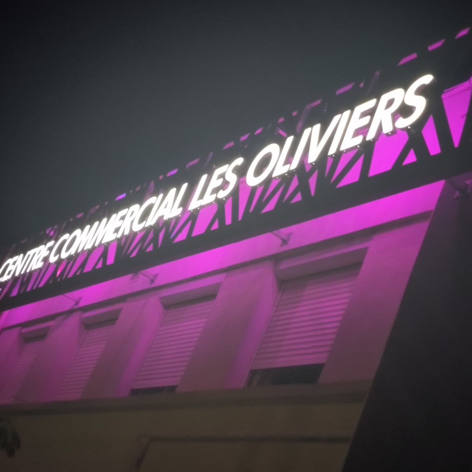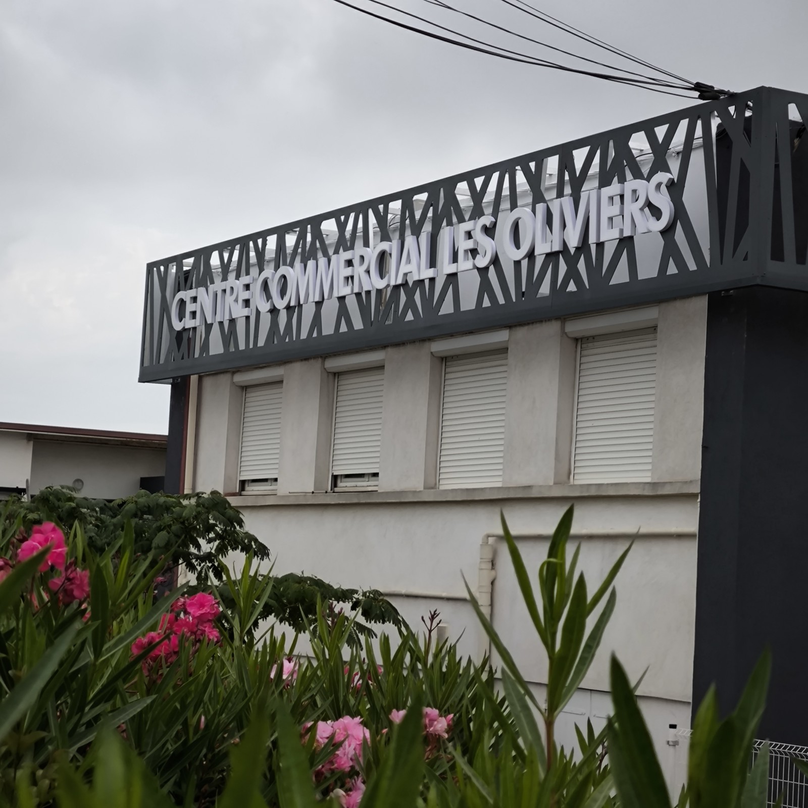 Le texte « CENTRE COMMERCIAL LES OLIVIERS » est composé de lettres boîtiers aluminium lumineuses, assurant une excellente lisibilité et une finition professionnelle.