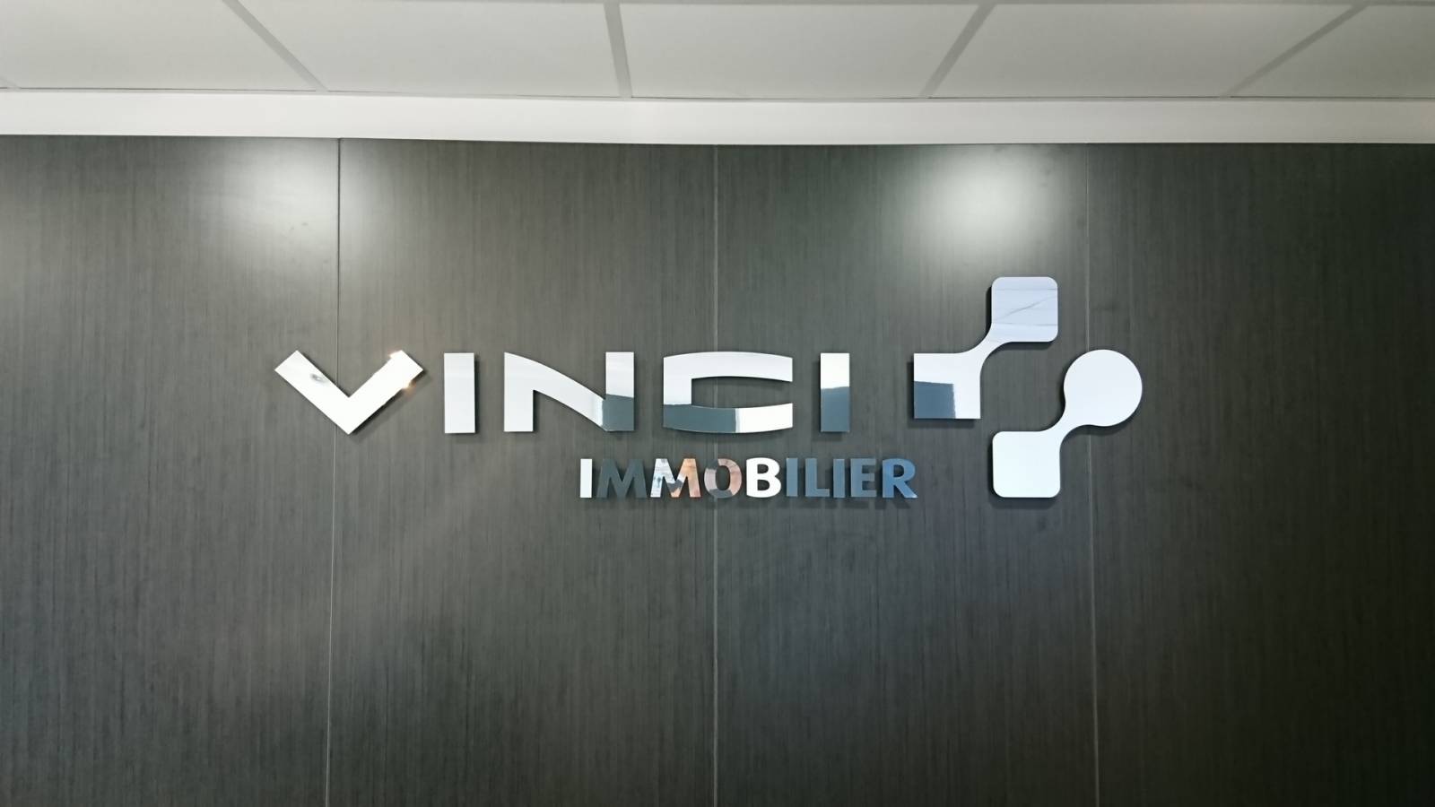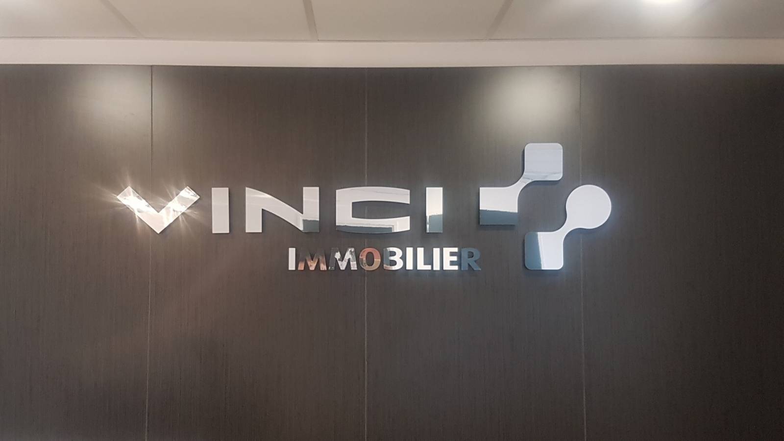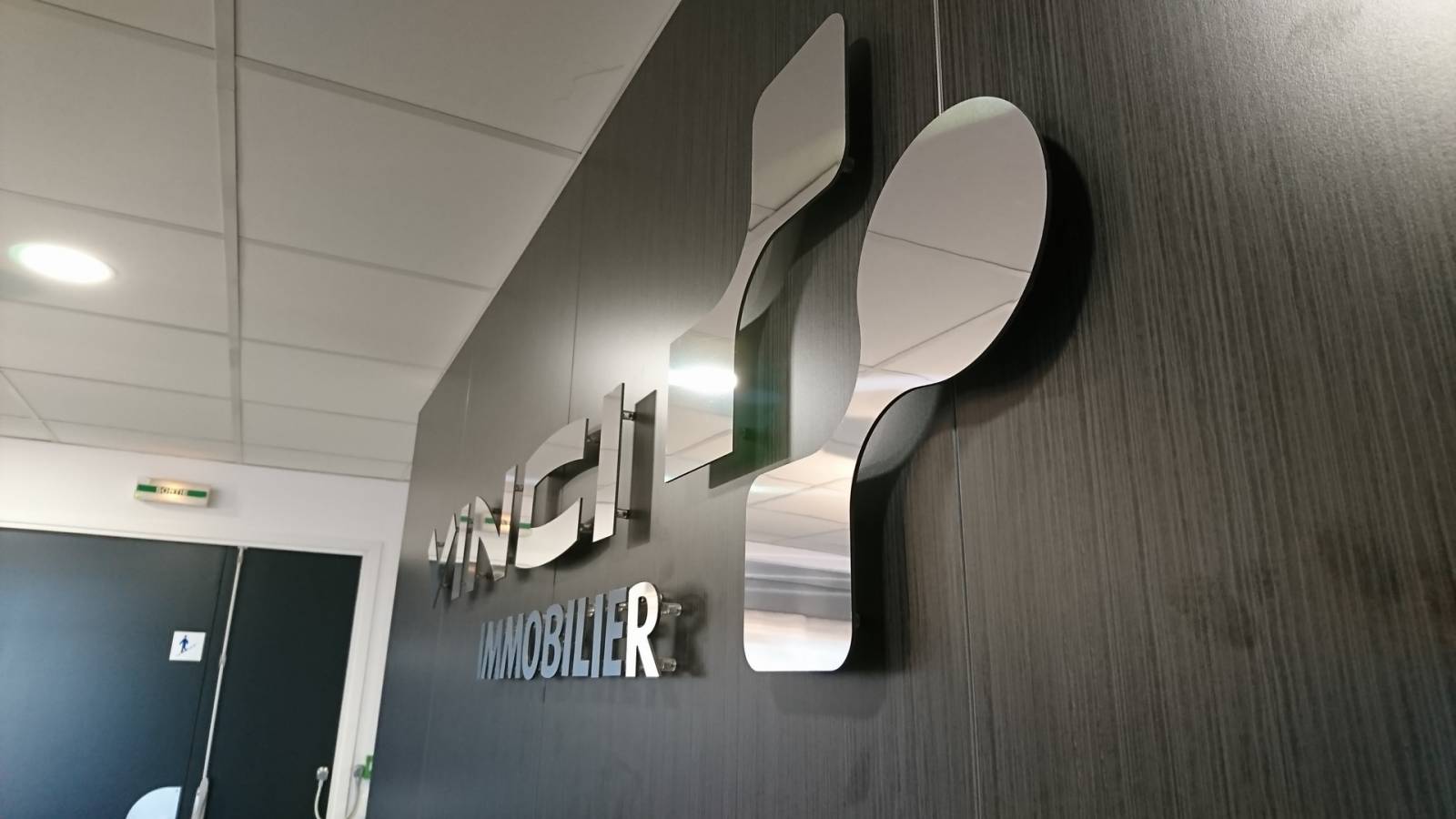 La société Vinci Immobilier située à Aix-en-Provence nous a confié pour la décoration et la signalisation de ses locaux, la réalisation de son logo en Lettres découpées dibond miroir.