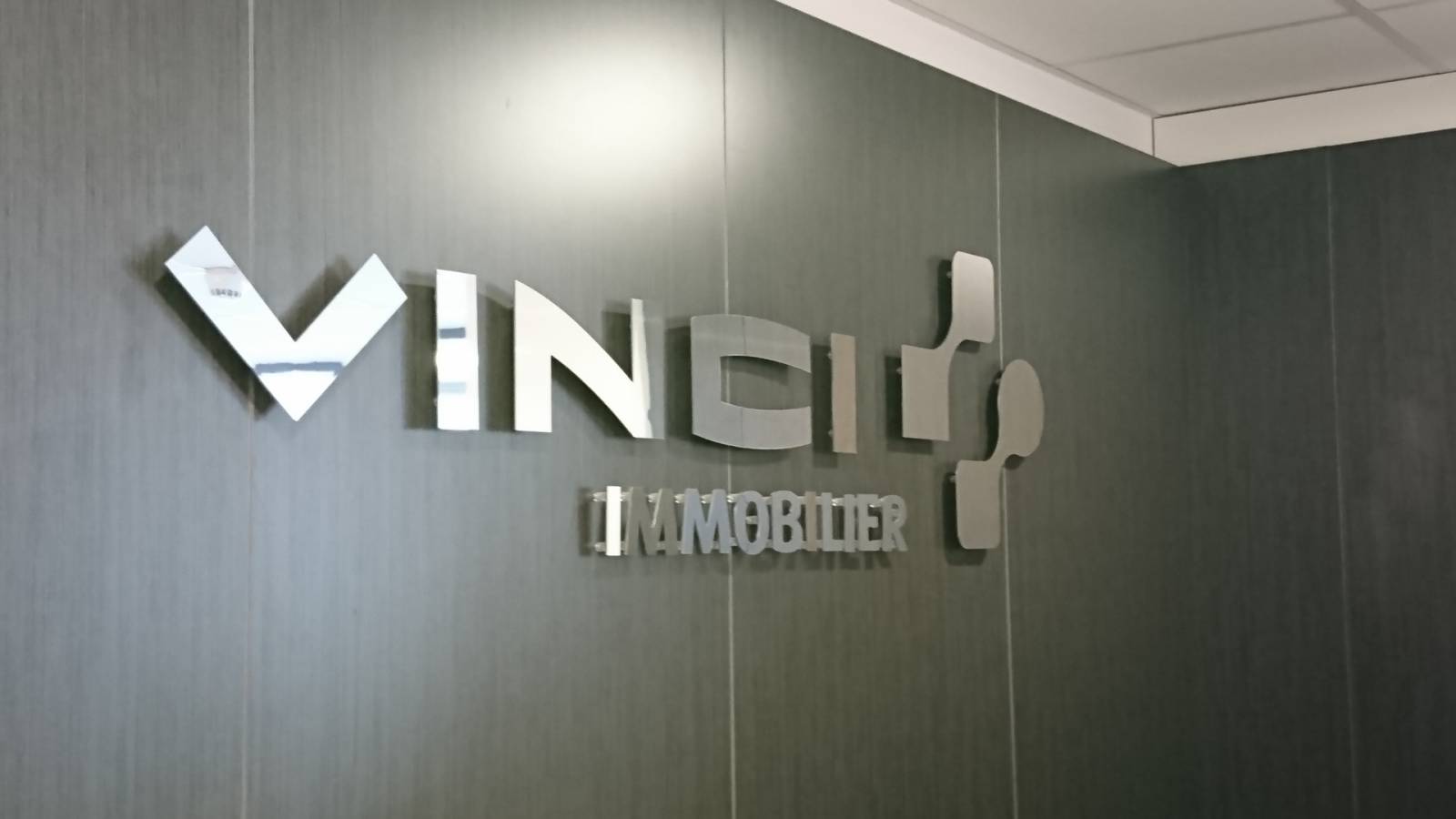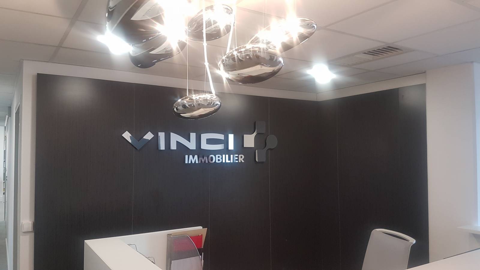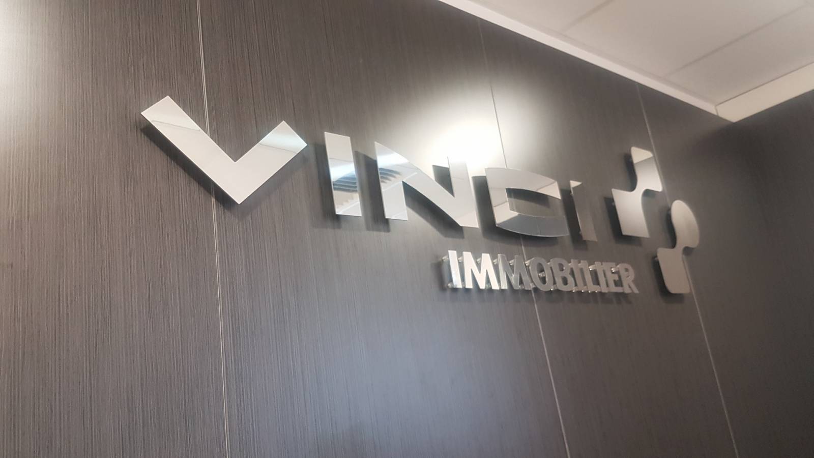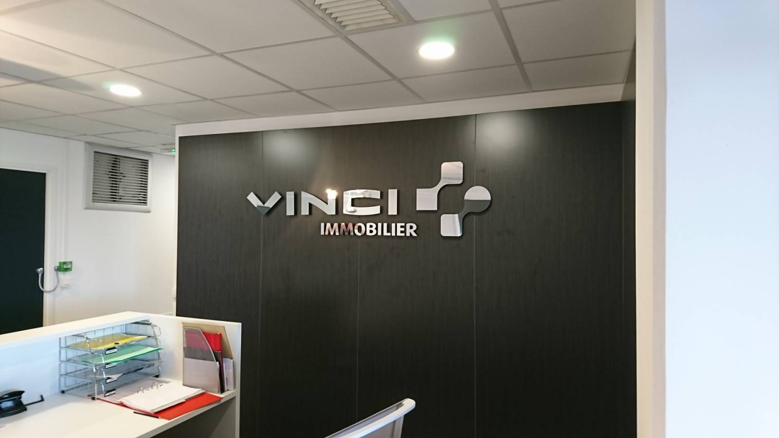 La société Vinci Immobilier située à Aix-en-Provence nous a confié pour la décoration et la signalisation de ses locaux, la réalisation de son logo en Lettres découpées dibond miroir.
