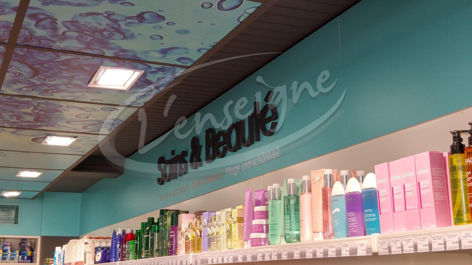 Pour cela nous avons appliqué sur le faux plafond un adhésif décoratif puis nous avons fixé des lettres reliefs afin de faciliter les recherches de la clientèle en magasin et d'exploiter le potentiel de la pharmacie dans son intégralité.