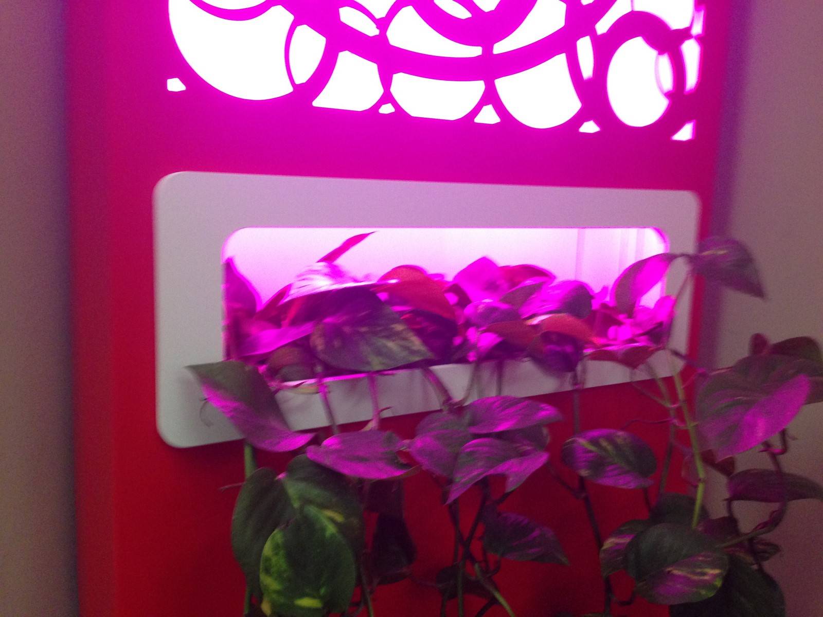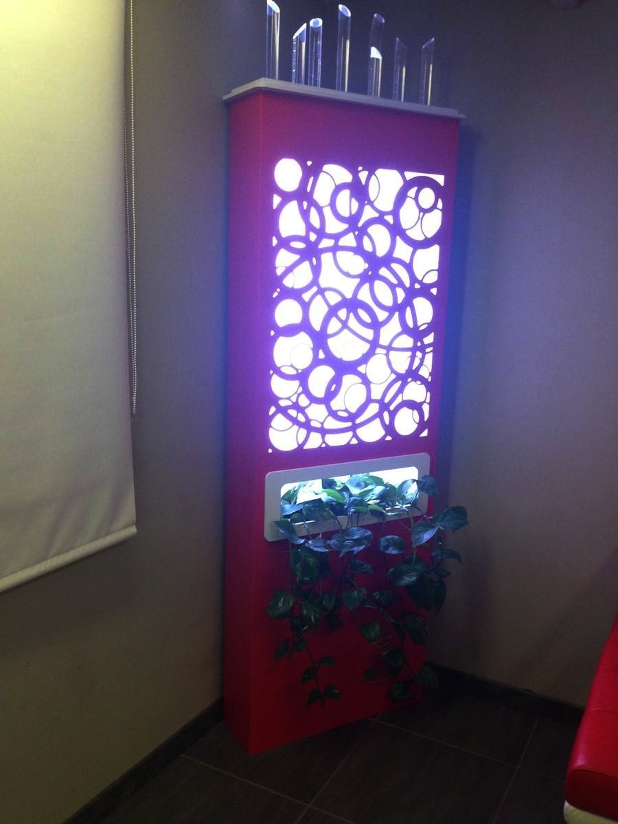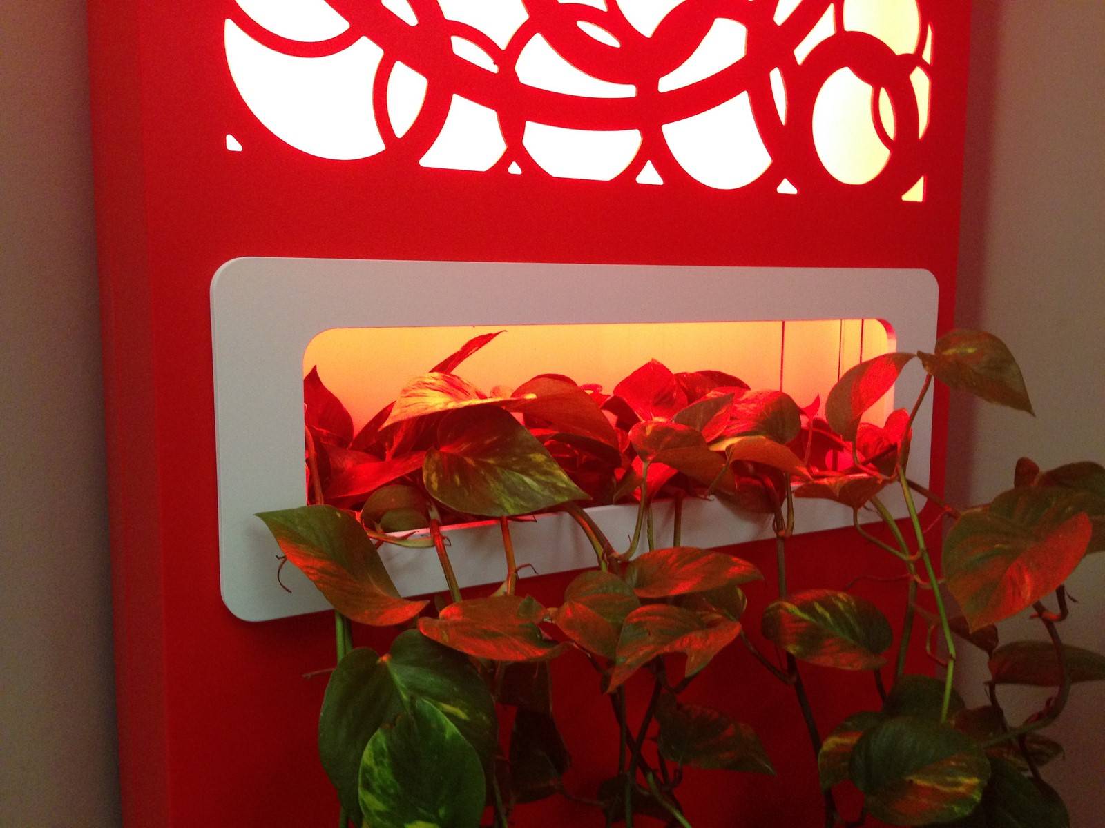 Pour un particulier, L'Enseigne a réalisé cette colonne lumineux avec un décor en forme de cercles entrelacé. Des diodes à changement de couleur sont installées à l'intérieur. Un espace jardinière a été intégré afin d'avoir dans le même élément une lumière d'ambiance et un espace de verdure.