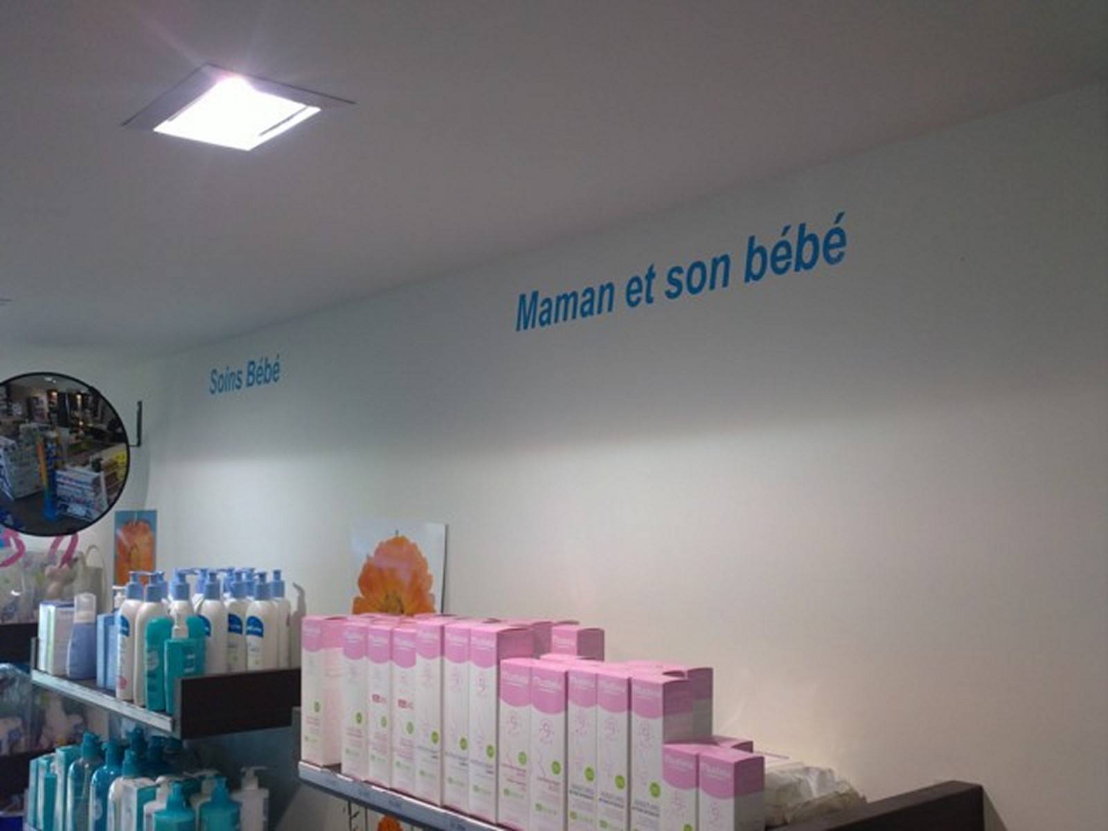 A l'intérieur, de l'adhésif de découpe a été apposé sur des panneaux plats dans les différentes zones de la Pharmacie afin de faciliter l'agencement des rayons.