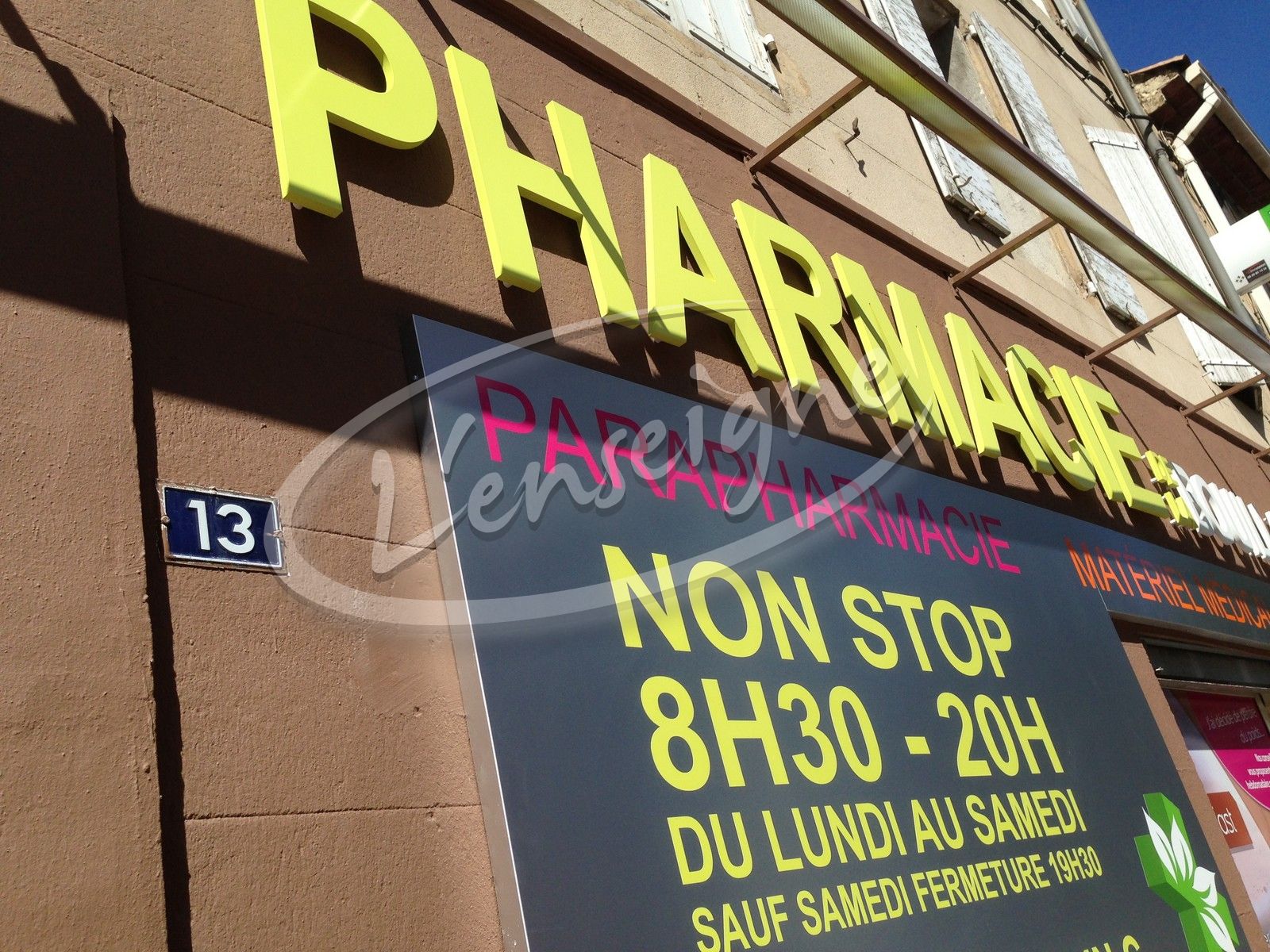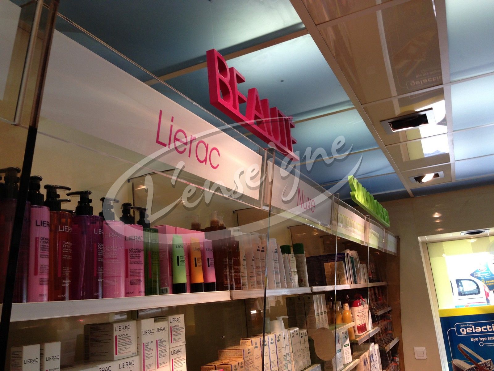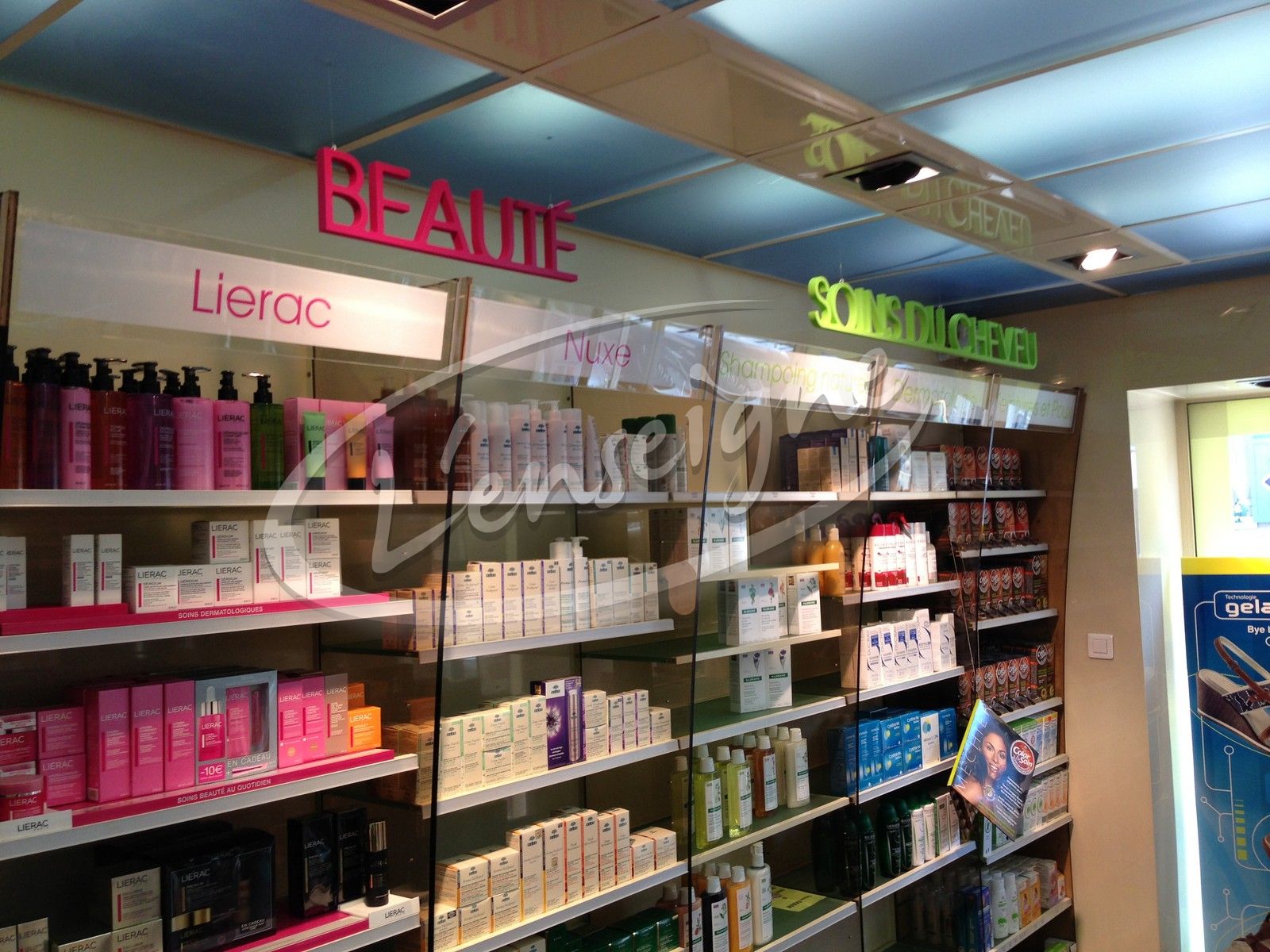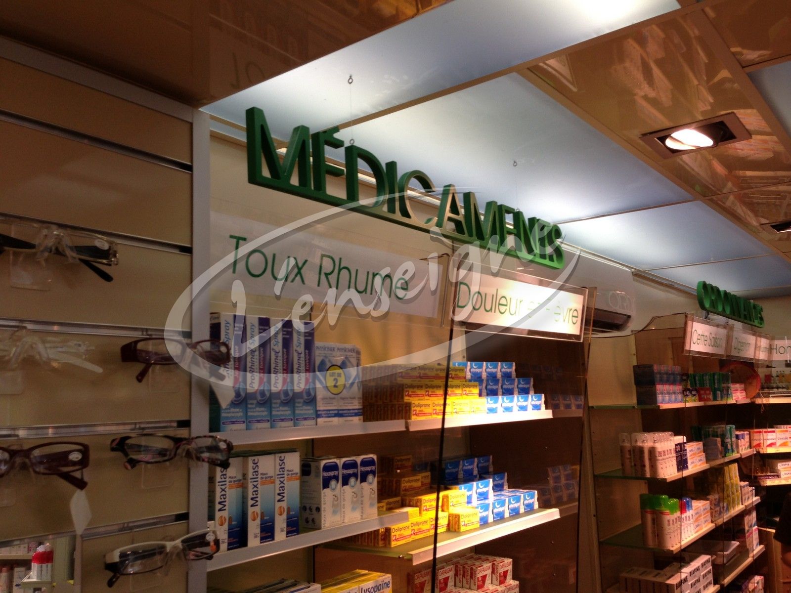 A l'intérieur de la pharmacie, la signalétique est en lettres reliefs peintes de différentes couleurs, les textes sont suspendus au plafond.