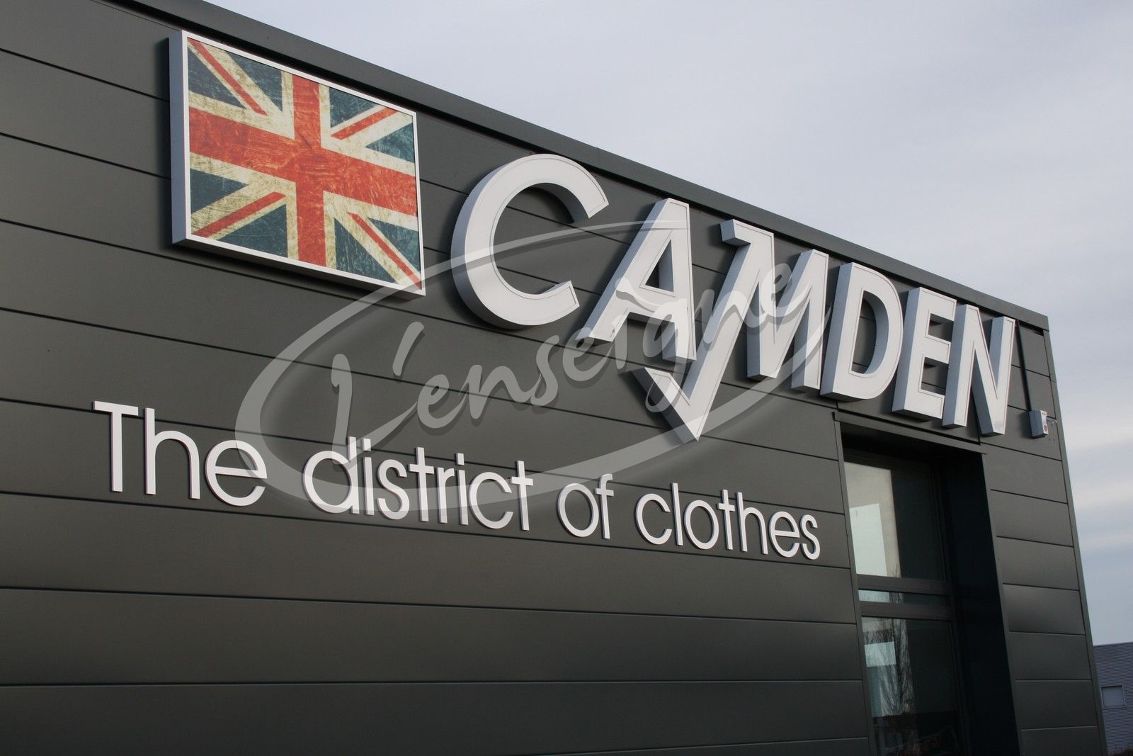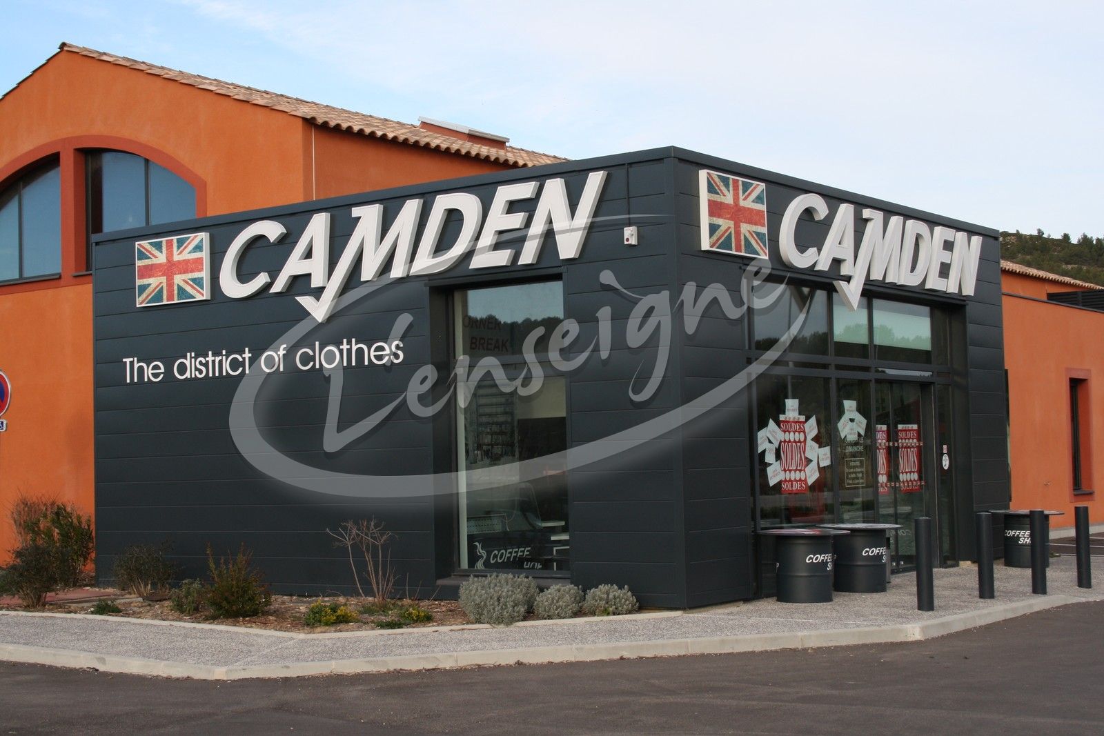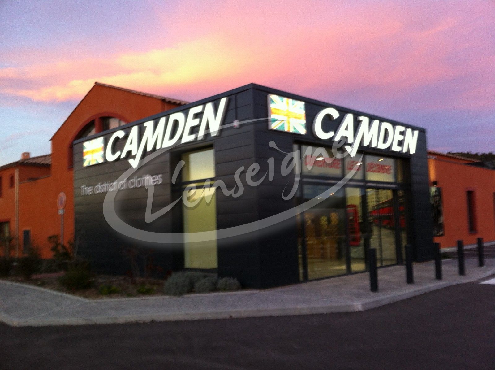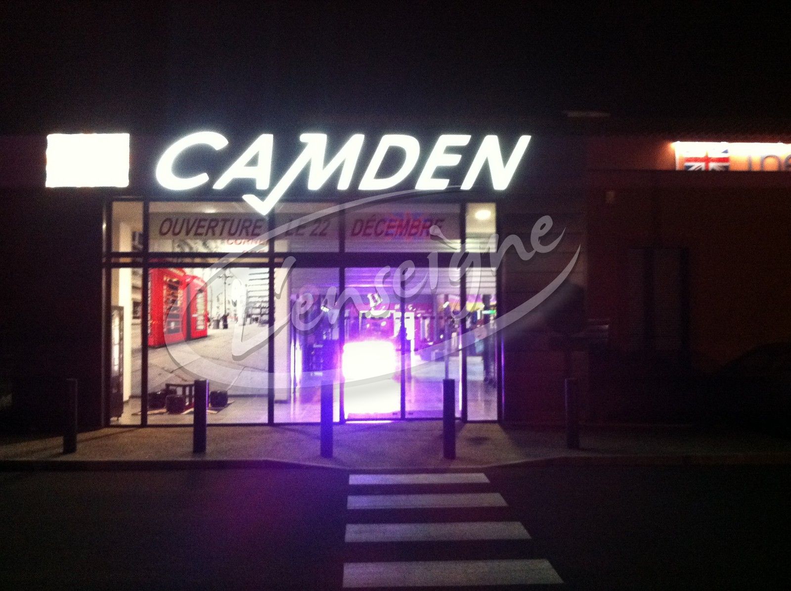 Sur ce projet, le texte CAMDEN est réalisé en lettres boitiers aluminium laqué avec les faces avant lumineuses en plexiglas blanc diffusant.