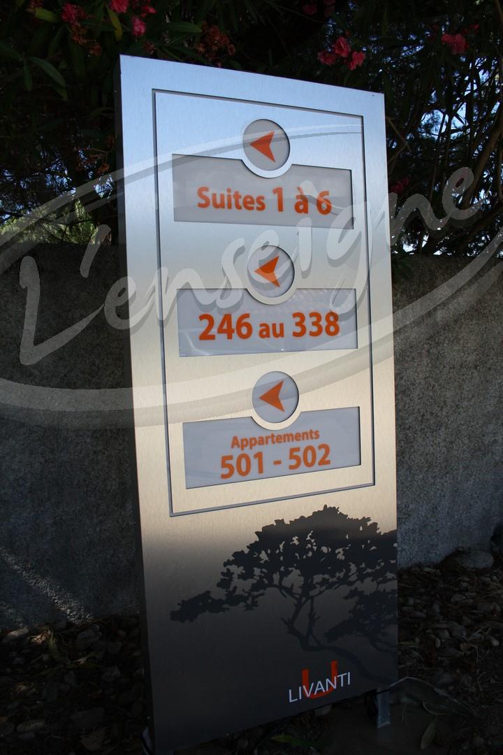 Pour cette résidence de vaccance nous avons également réalisé les plaques de porte pour les chalets ainsi que des caissons lumineux.